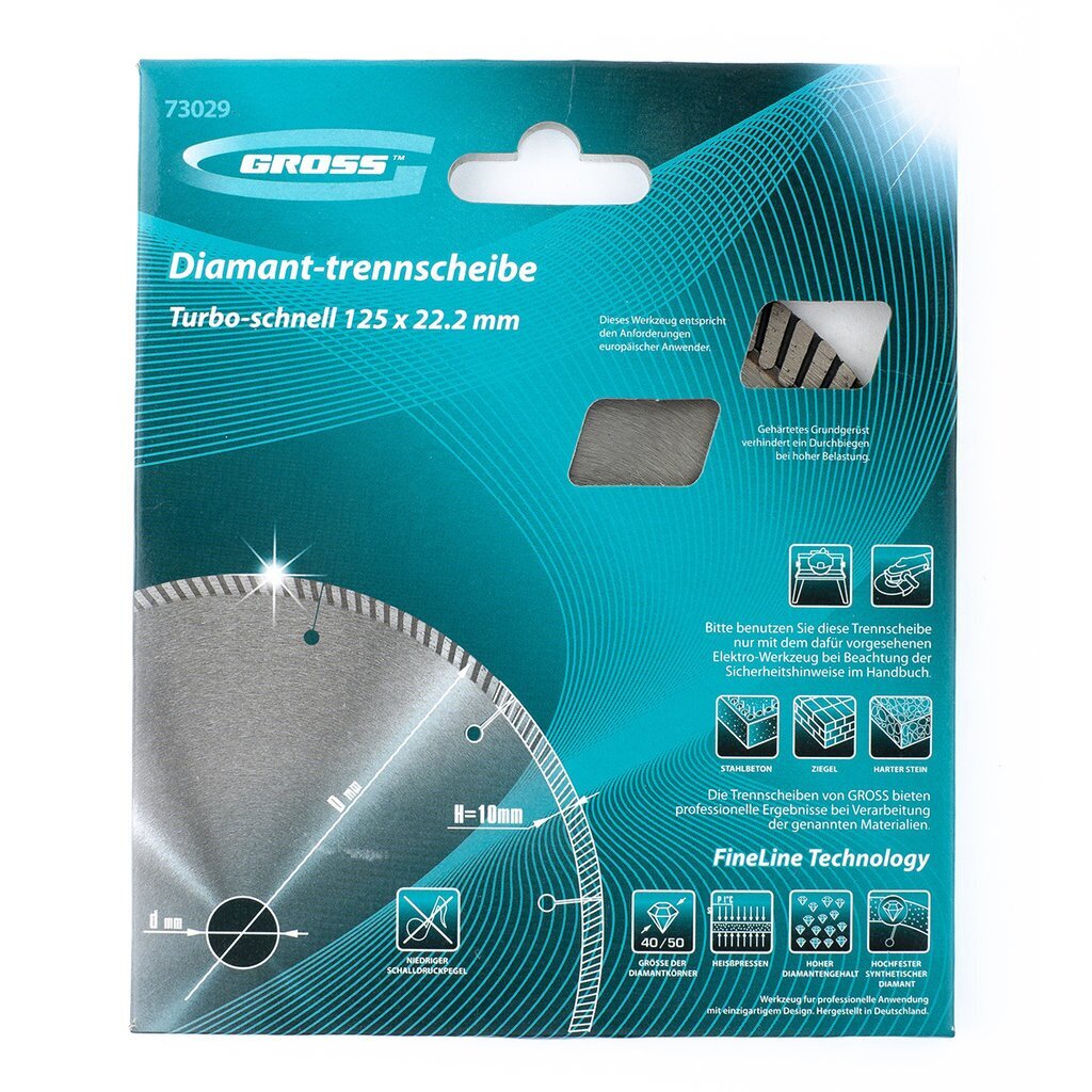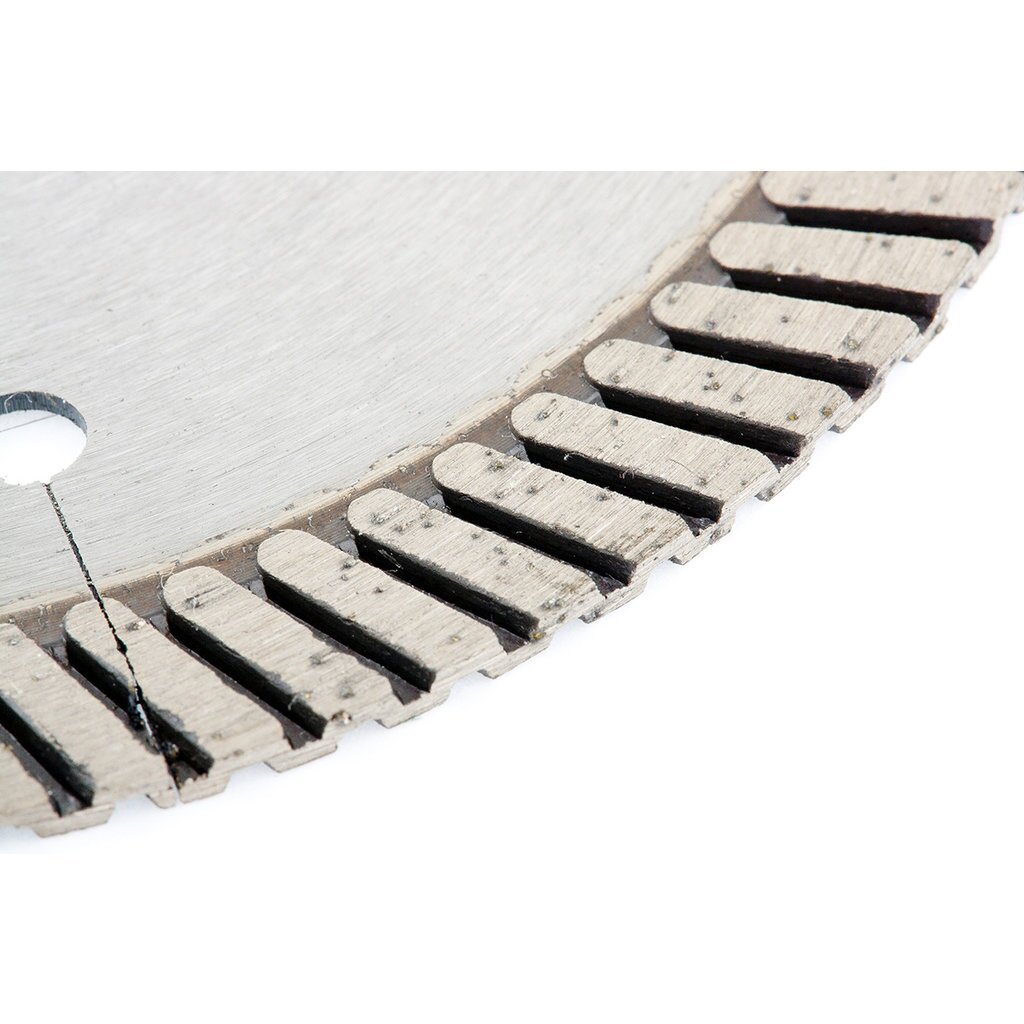Универсальный алмазный диск ТМ GROSS предназначен для резки материалов: армированный бетон, бетон, кирпич, камень, гранит, шлакоблок, мрамор, тротуарная плитка. Тип диска 1A1R Turbo (Турбо) с лазерной перфорацией, которая усиливает охлаждение диска во время интенсивной резки. Режущий сегмент высотой 10 мм, с высокой концентрацией крупных синтетических алмазов 40–50 мкм повышает износостойкость диска и увеличивает скорость реза. Для использования на УШМ (болгарке) соответствующего типоразмера. Сухой рез, без использования водяного охлаждения. Рекомендован для профессионального использования и большого объема работ.