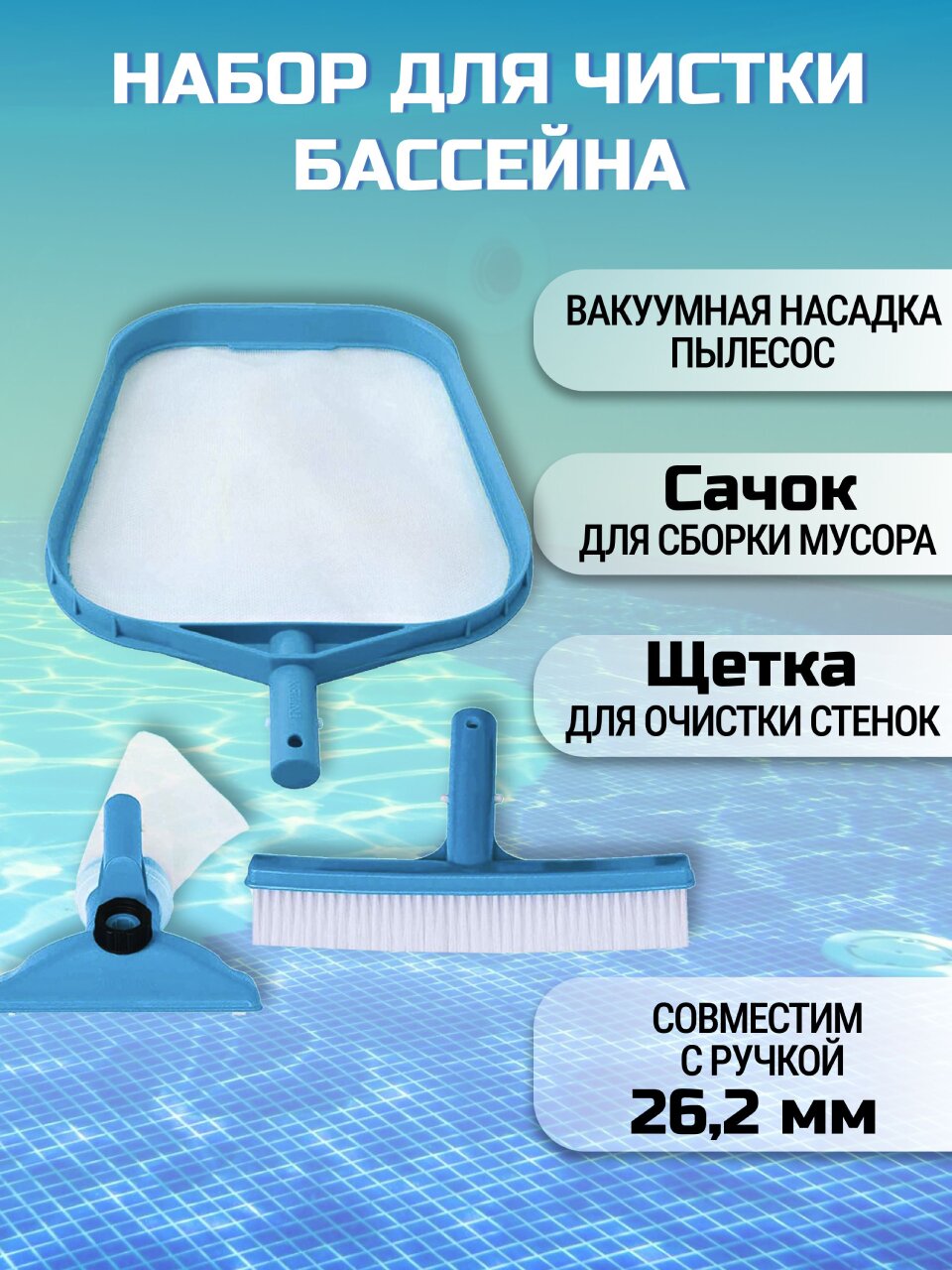 Набор для чистки бассейна включает в себя все необходимые элементы для поддержания чистоты и порядка. В комплект входят: сачок для сбора мусора с поверхности воды, щетка для тщательной очистки стенок и дна бассейна, насадка-пылесос с адаптером для подключения к садовому шлангу, а также прозрачный сетчатый мешочек для сбора мусора. Дополнительно предусмотрен переходник, обеспечивающий совместимость с телескопической ручкой с внутренним диаметром 26.2 мм, что делает использование набора еще более удобным.
