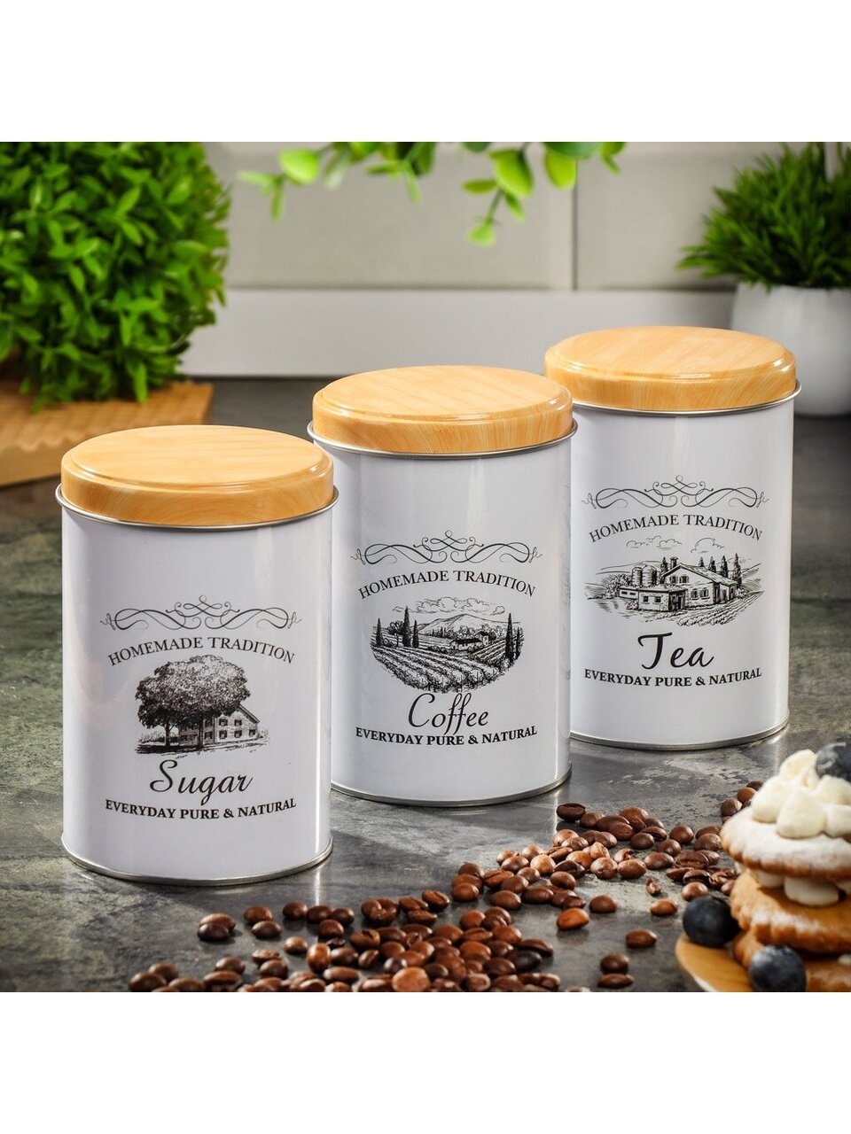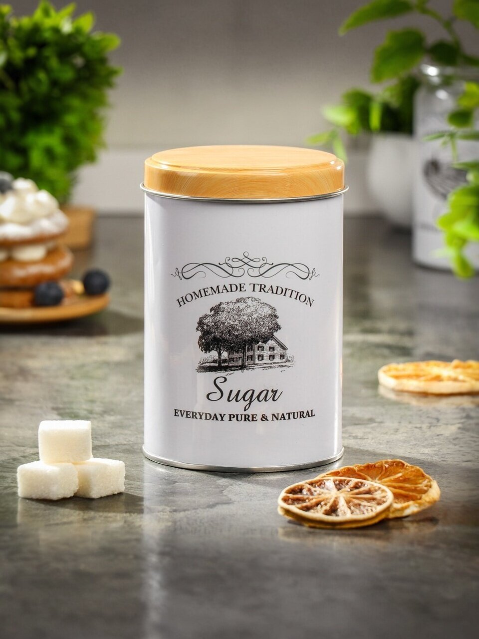Оригинальная банка для сыпучих продуктов изготовлена из окрашенной стали. Это практичный материал, который прослужит долго. Банка декорирована рисунком и надписью. Такая емкость станет прекрасным украшением на вашей кухне.