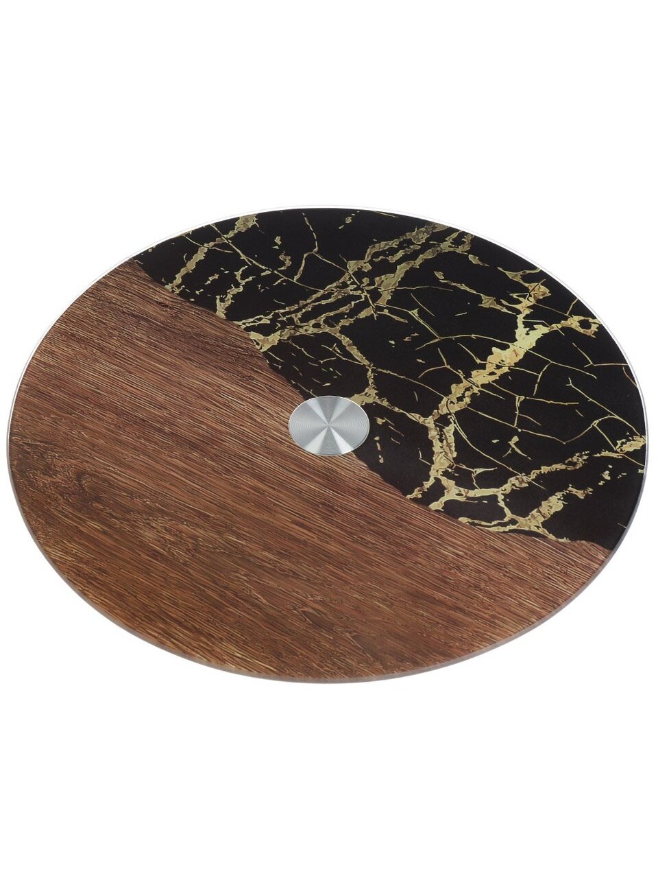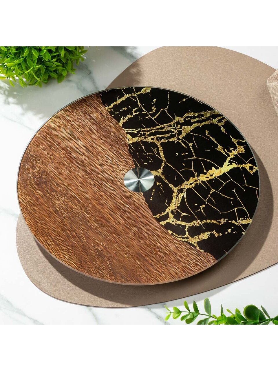 - Диаметр 30 см, закалённое стекло с мраморным рисунком — прочность и эстетика для сервировки