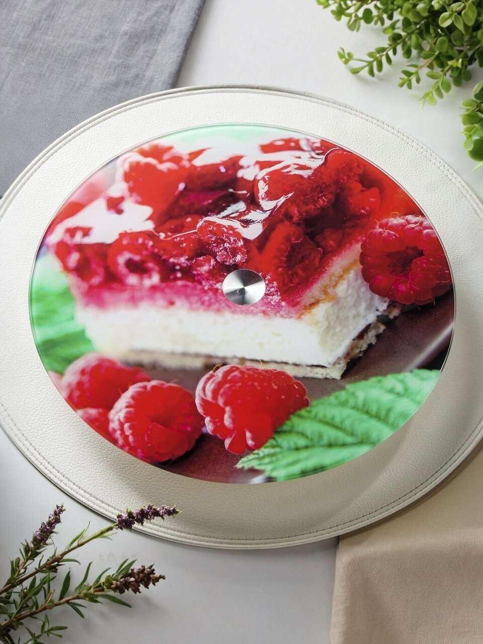 Вращающееся стеклянное блюдо 28 см с рисунком для эффектной сервировки тортов и закусок — идеальный подарок для дома и праздника.