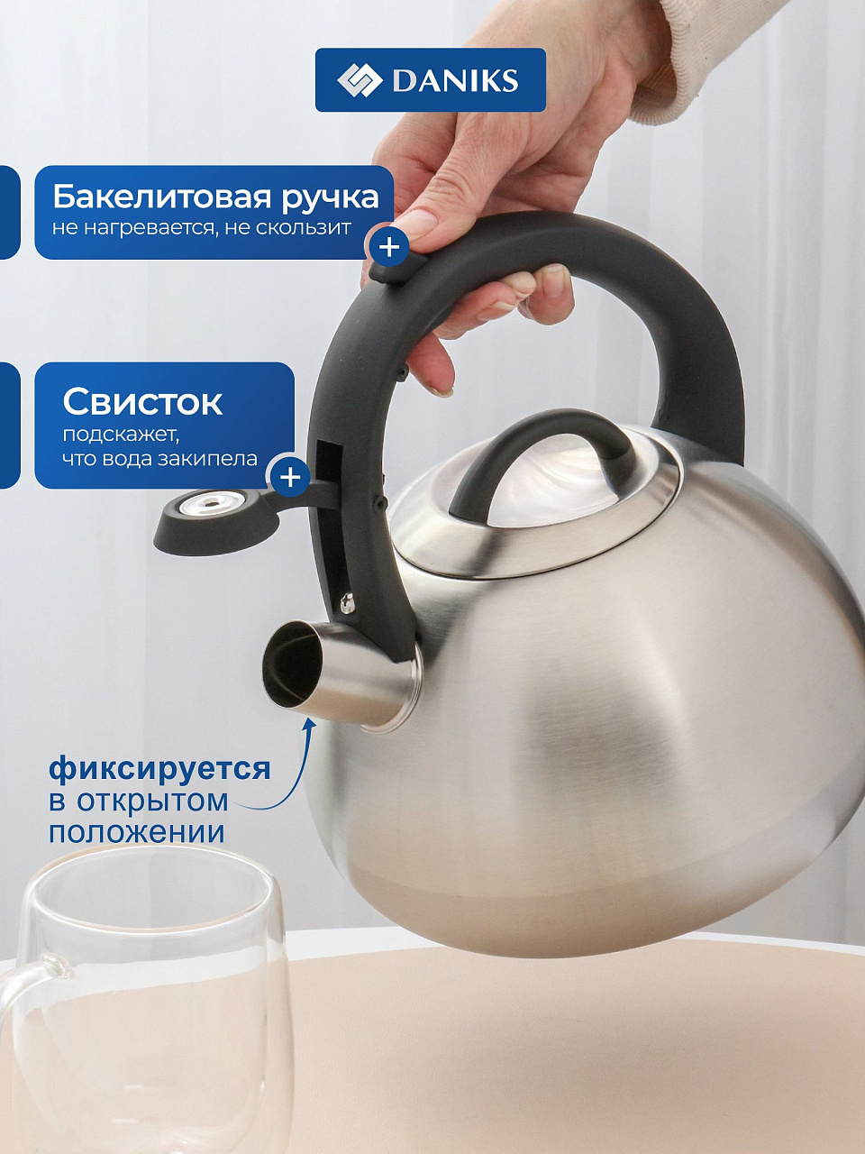 Чайник Daniks 2.7 л для индукции: стальной корпус, бакелитовая ручка с силиконовым покрытием, безопасный свисток — идеален для кухни и дачи
