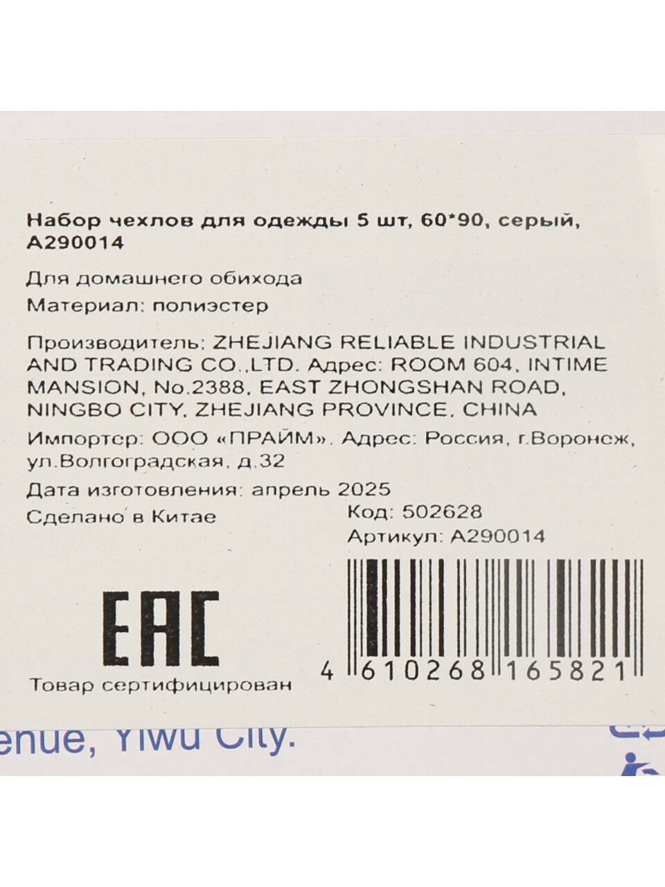 Вы можете приобрести «Набор чехлов для одежды 60х90 см, полиэстер, без кармана, 5 шт, серый, A290014» и другие товары в нашем интернет-магазине в Орле по низким ценам и с бесплатным самовывозом.
