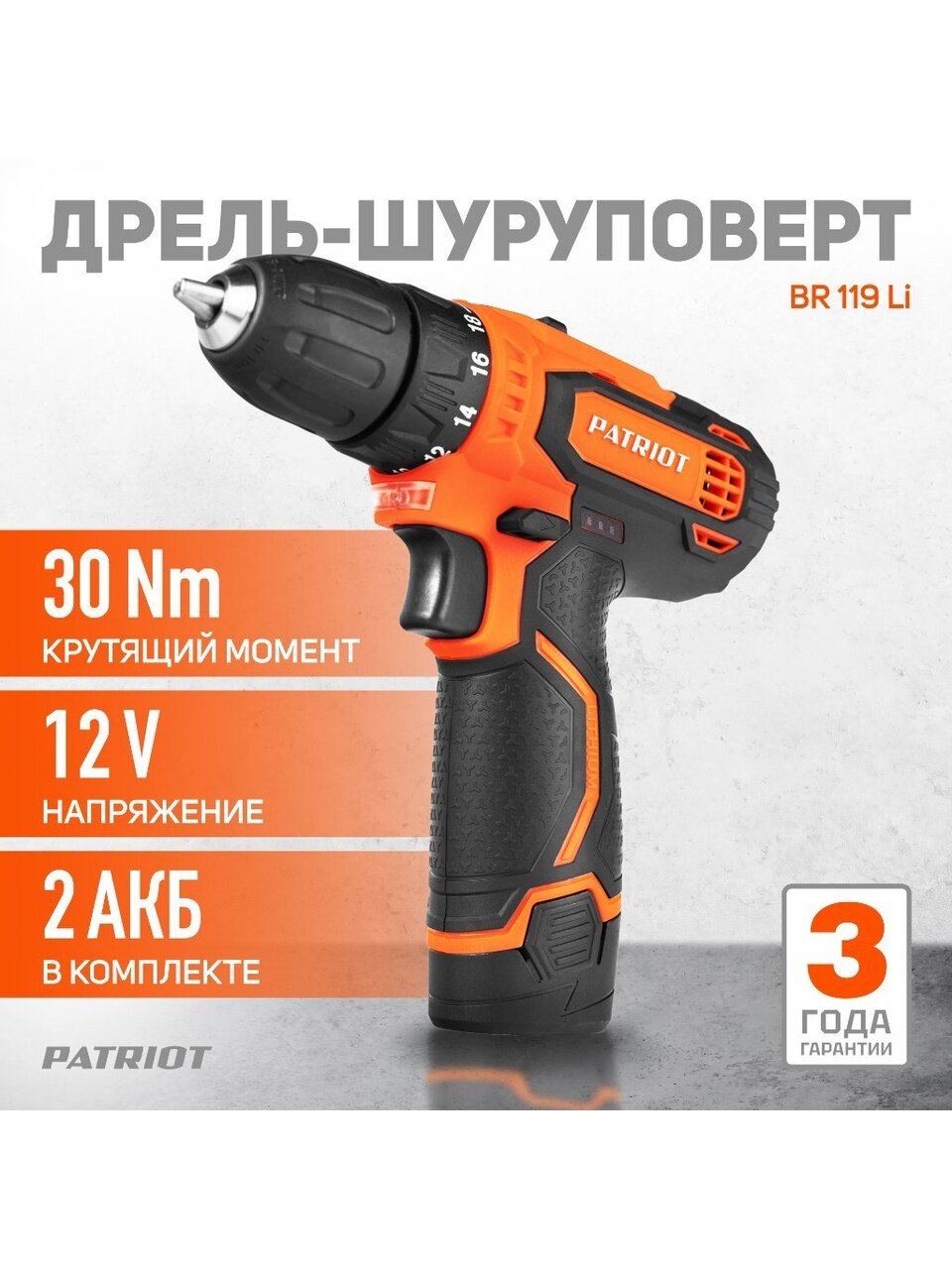 Patriot BR 119Li - это надежный и удобный шуруповерт, предназначенный для широкого спектра задач. Благодаря мощному мотору и быстрозажимному патрону, он легко справляется как с закручиванием крепежа, так и со сверлением отверстий в различных материалах.
