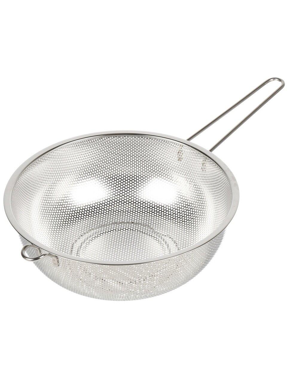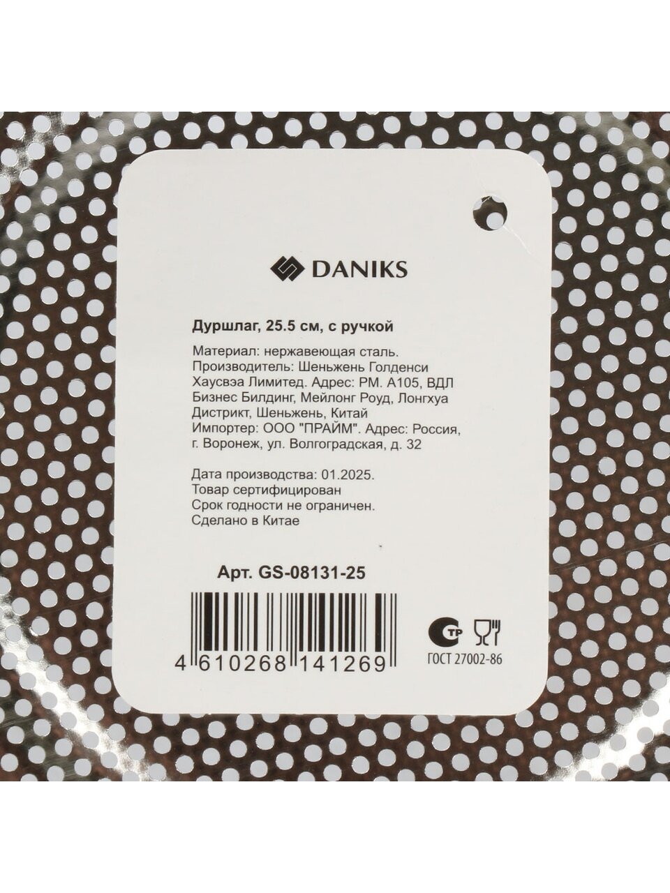 Дуршлаг из нержавеющей стали 25,5 см с ручкой Daniks GS-08131-25: легко промывайте, быстро сцеживайте, долговечность для кухни и дачи.