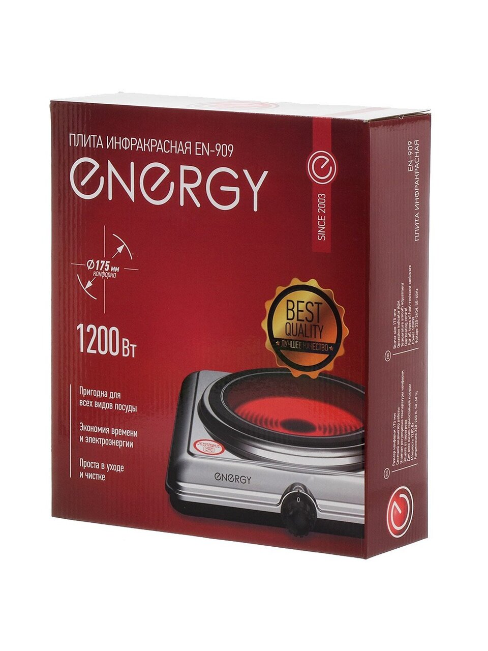 Вы можете приобрести «Плита электрическая Energy, EN-909, 1200 Вт, 1 конфорка, инфракрасная, стеклокерамика, механическая, переключатель поворотный, серебристая» и другие товары в нашем интернет-магазине в Орле по низким ценам и с бесплатным самовывозом.