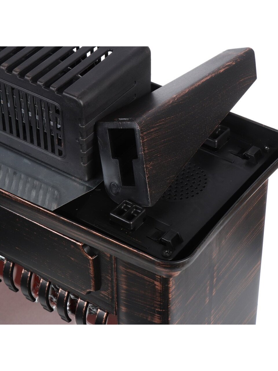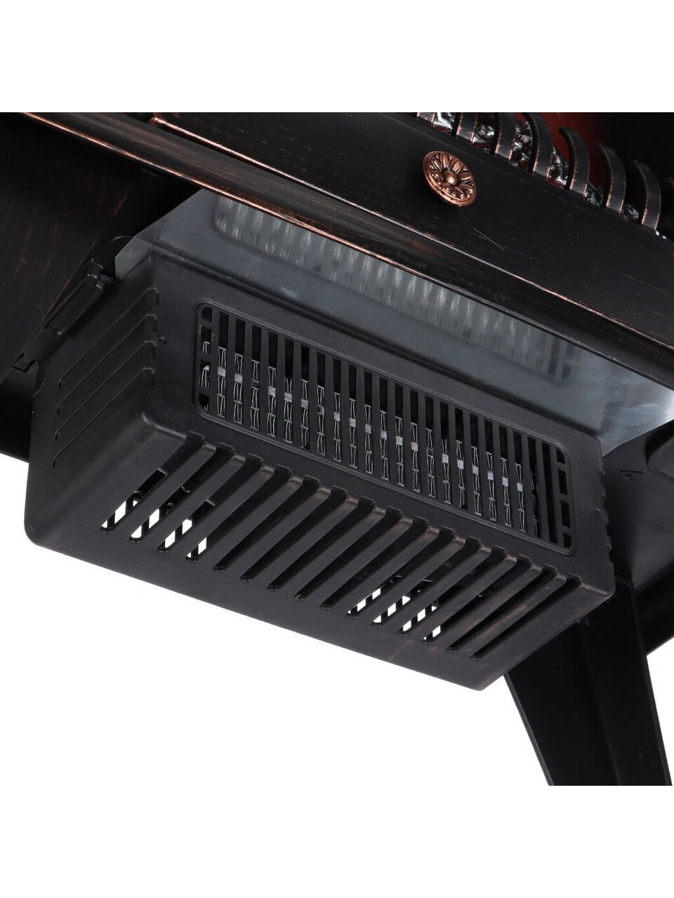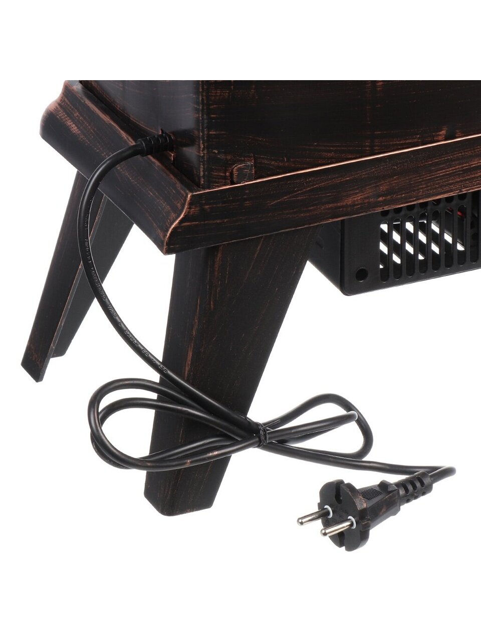 Камин оснащён тепловентилятором мощностью 1000 Вт, работает от сети, не требует монтажа, не содержит 3D-очага и дополнительных функций вроде термостата или пульта ДУ.
