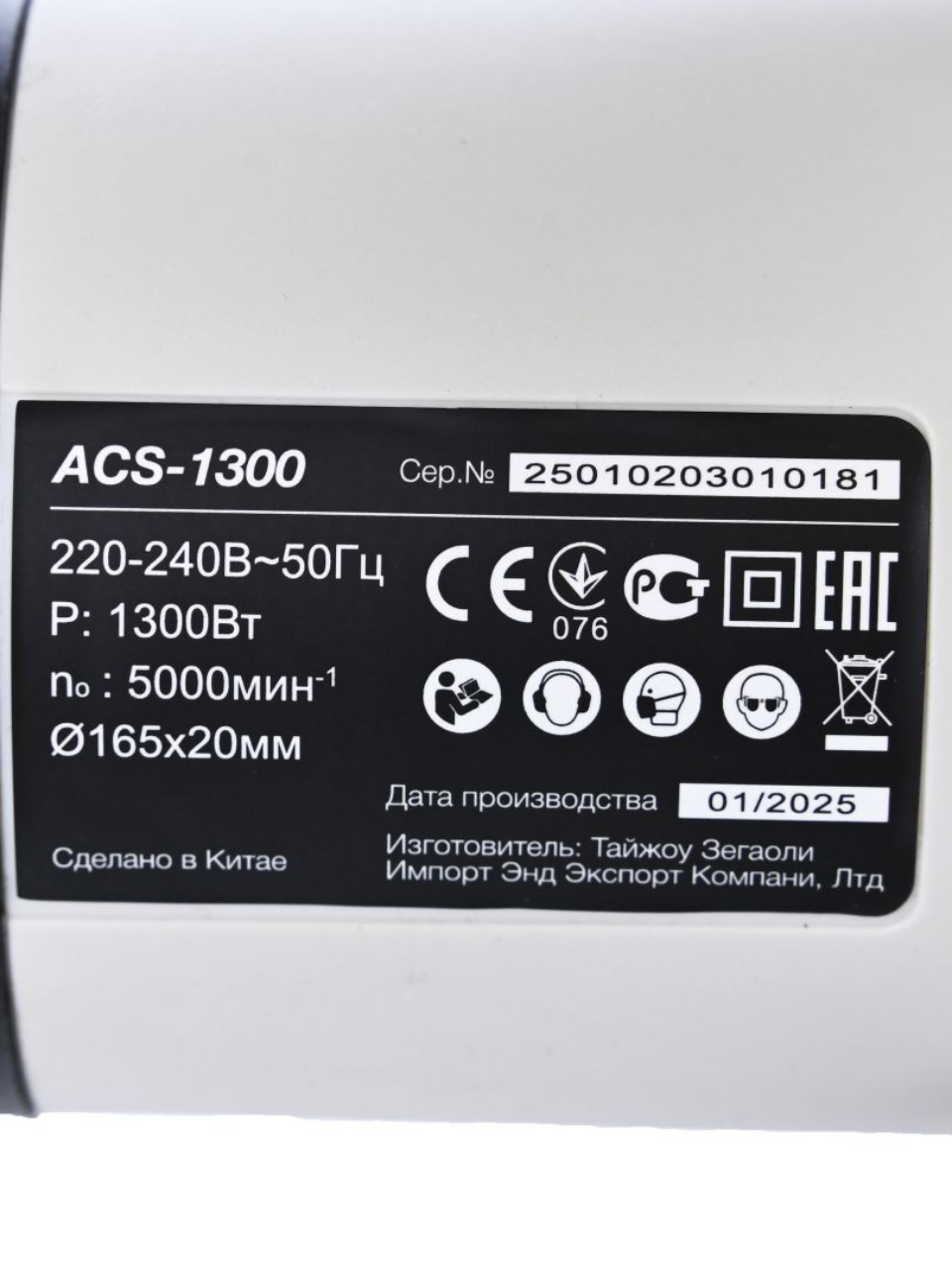Диаметр диска — 165 мм, посадочный диаметр — 16 мм, мощность двигателя — 1300 Вт, скорость вращения — до 5000 об/мин.