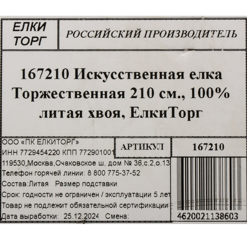 Подарите себе и близким атмосферу настоящего праздника — оформите заказ на напольную елку 210 см «Торжественная» с выгодной доставкой и официальной гарантией от ЕлкиТорг.