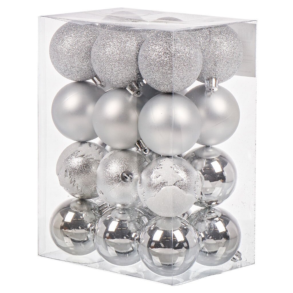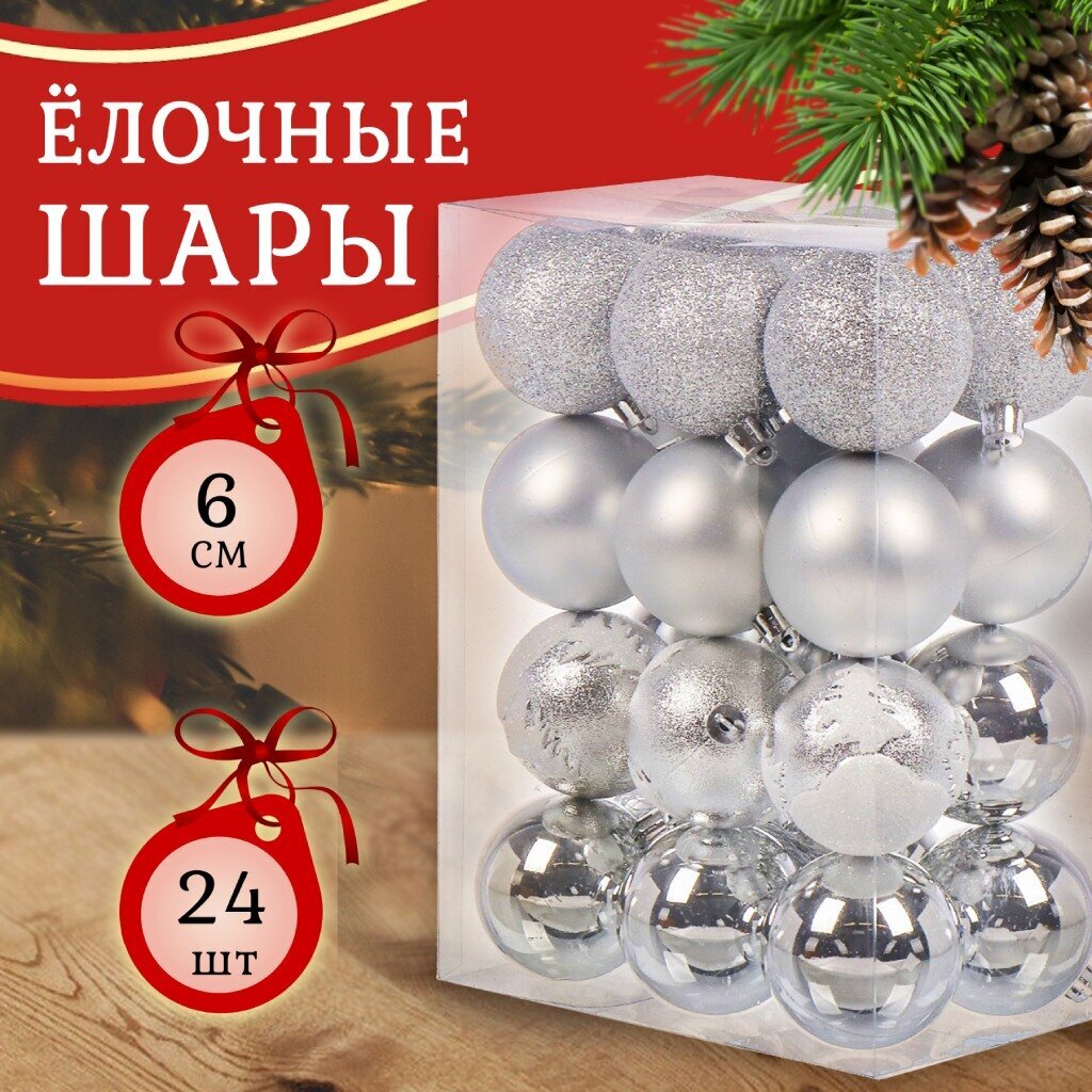 Набор елочных украшений 24 шт, серебро, 6 см — стильное решение для праздничного декора, подходит для елки дома, офиса или подарка. Прочный пластик, блеск и небьющаяся основа.