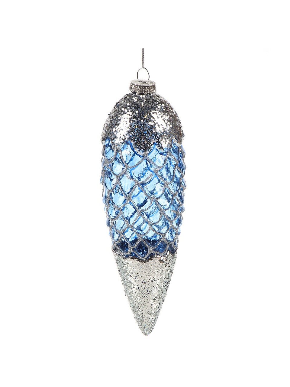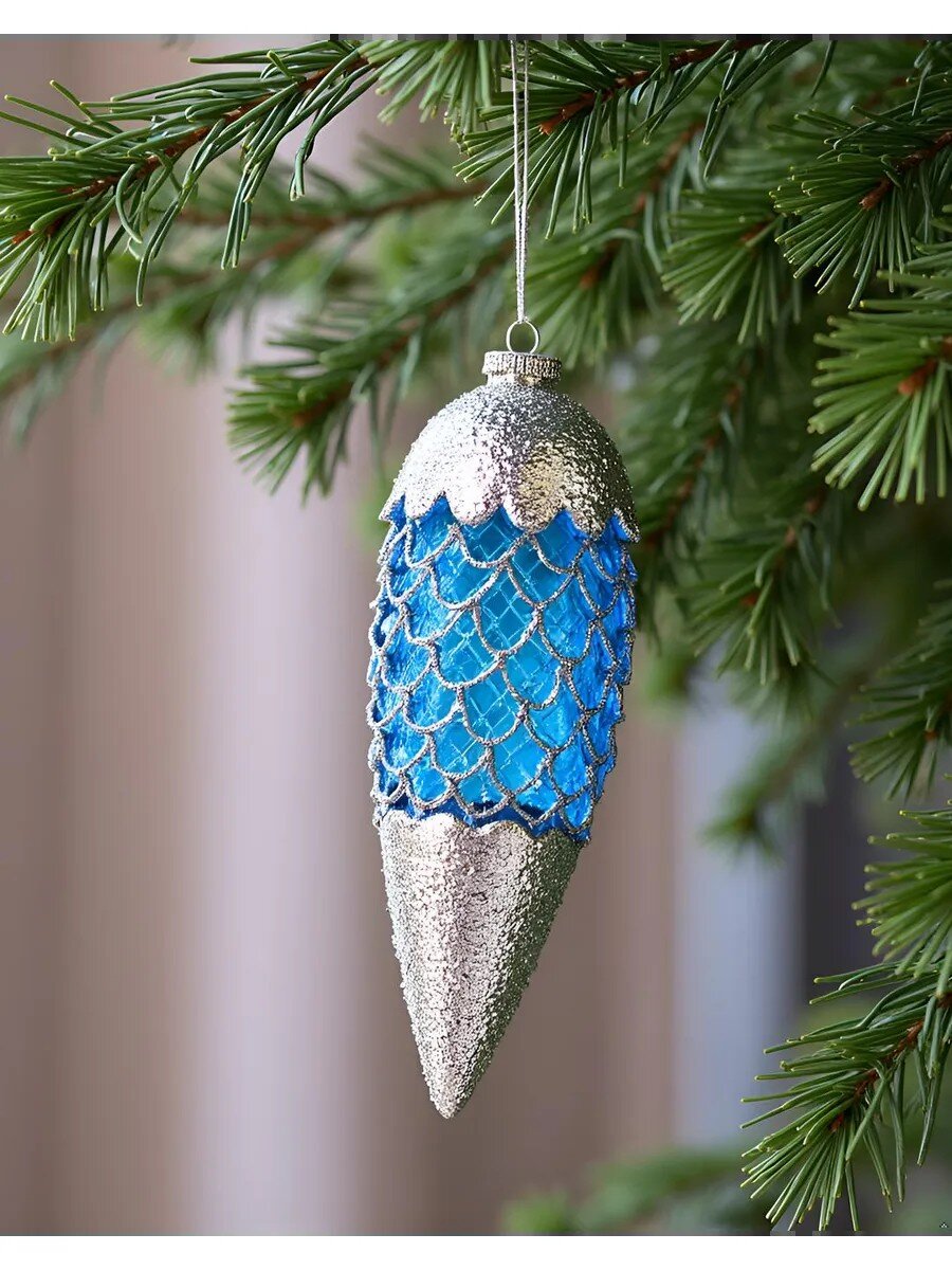 Елочное украшение Шишка Синий перламутр 18 см — стильное стеклянное украшение с блестками для эффектного новогоднего декора дома, дачи или подарка.