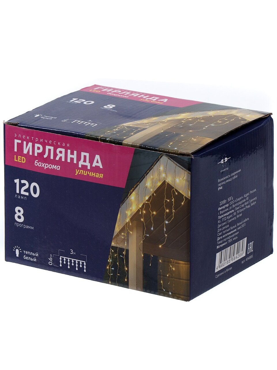 Вы можете приобрести «Гирлянда 120ламп, 3х0.6 м, 1 режим, Бахрома, теплый белый свет, белая, на улице, сетевая, LED» и другие товары в нашем интернет-магазине в Шахтах по низким ценам и с бесплатным самовывозом.