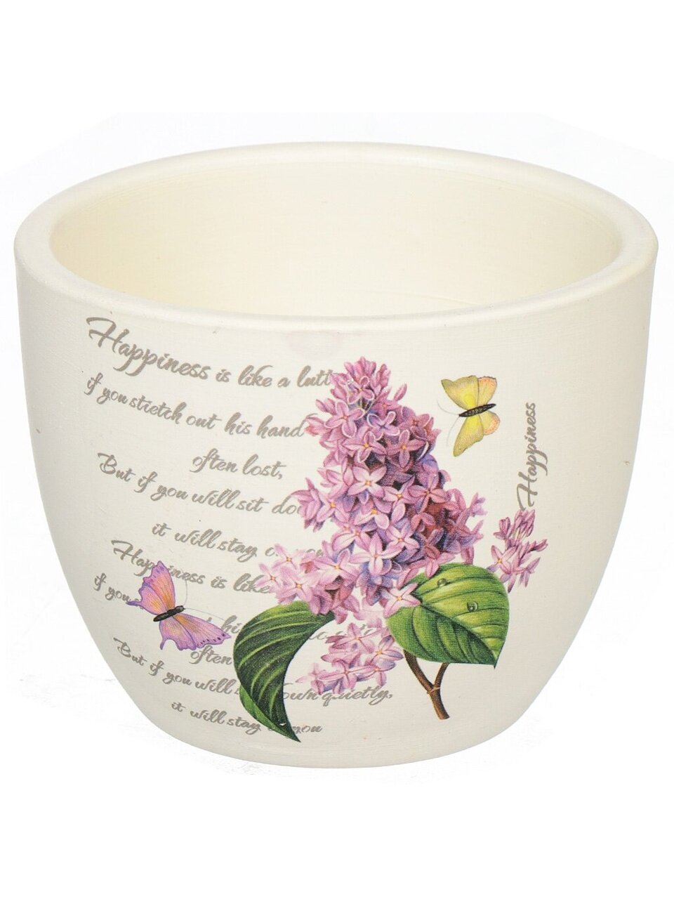 Цветочные кашпо и горшки из керамики, сохранили все преимущества и полезные свойства глины: циркуляция воздуха и воды в горшке, сбалансированный теплообмен между почвой с корневищем растения и средой, окружающей растение. Рисунок с одной стороны. Рисунок является наклейкой.