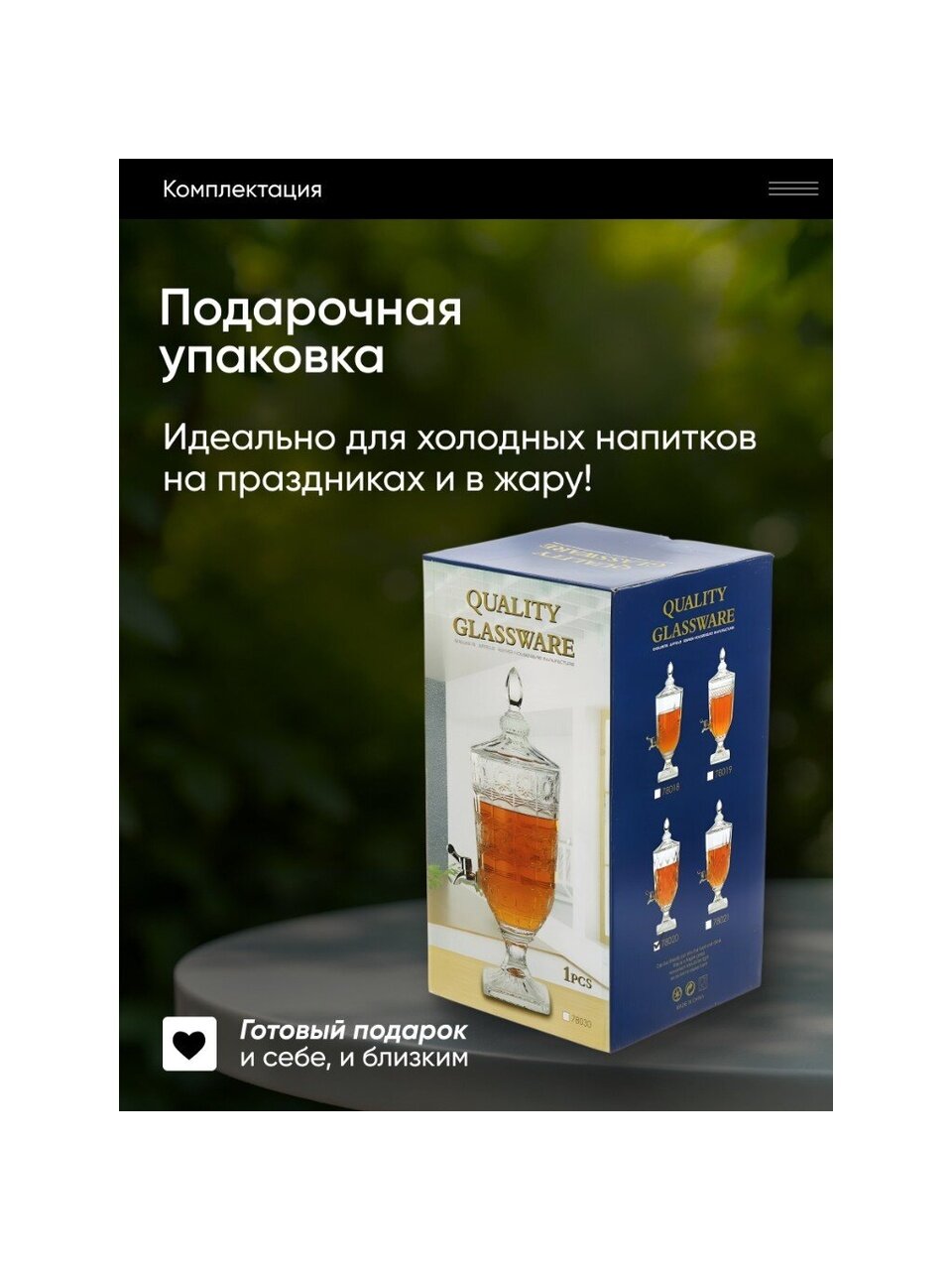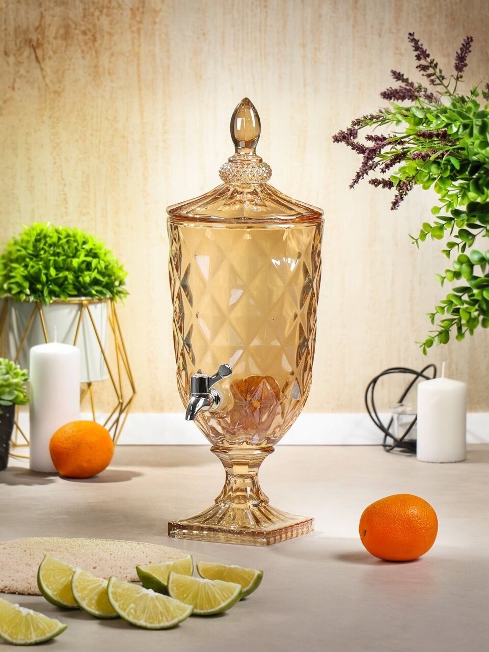 Диспенсер для напитков "Лимонадница" представляет из себя классический графин для холодных напитков с удобным краном. Выполненная из высококачественного стекла и украшенная красивым рельефным узором, емкость оснащена закрывающейся стеклянной крышко, которая не позволит выдохнуться аромату Ваших напитков. Элегантный дизайн изделия украсит собой любой праздничный стол, в таком диспенсере Вы сможете подать вино, морс, различные наливки и ликеры, цвет которых будет играть, преломляясь через рельефные внешние грани сосуда.