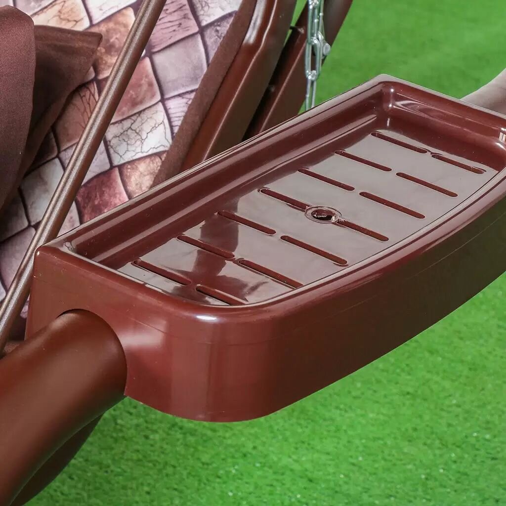 Конструкция качелей выполнена из прочного металла, что гарантирует долговечность и устойчивость. Металлическая решетка основания сиденья и дугообразная форма опоры обеспечивают надежность и безопасность. Тканевое сиденье и оксфордский тент создают уютную атмосферу, а коричневый цвет добавляет элегантности и стиля.