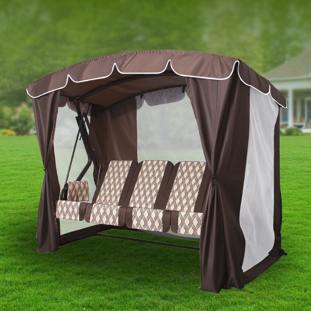 Качели выполнены в элегантном коричневом цвете с рисунком "полусоты", что придаёт им стильный и современный вид. Каркас из металла и основа сиденья из металлической решетки обеспечивают надежность и долговечность конструкции. Материал сиденья и тента - оксфорд, известный своей прочностью и влагозащитными свойствами.