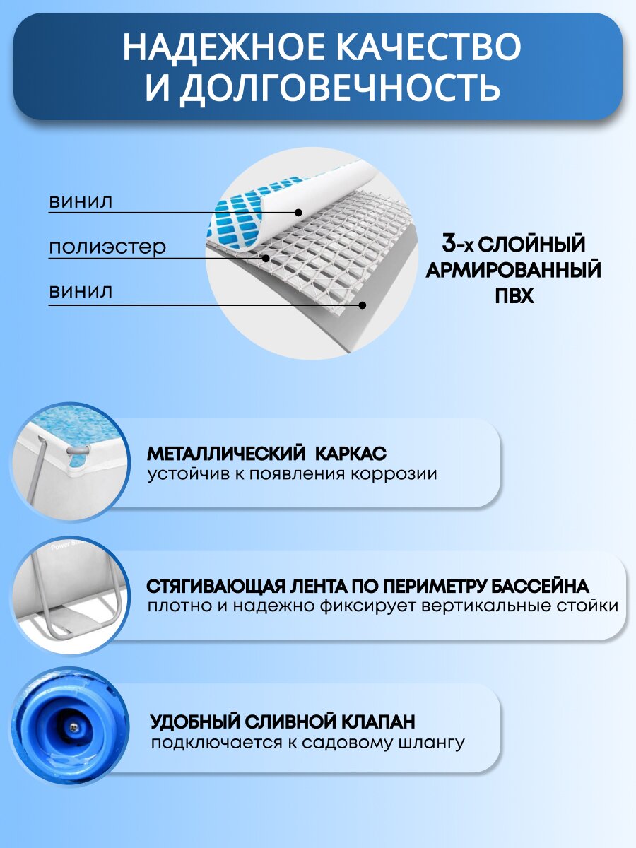 Чем отличается этот бассейн от аналогов? Усиленная конструкция из трёхслойного ПВХ и стального каркаса устойчива к механическим повреждениям и ультрафиолету, а сливной клапан облегчает уход. Модель легко собрать за 120 минут — инструкция на русском языке прилагается. Подходит ли для сезонной эксплуатации? Да, рекомендуется разбирать на холодное время года, что продлевает срок службы. Как выбрать размер бассейна для семьи? Этот вариант оптимален для 6-8 человек и не требует сложного монтажа.
