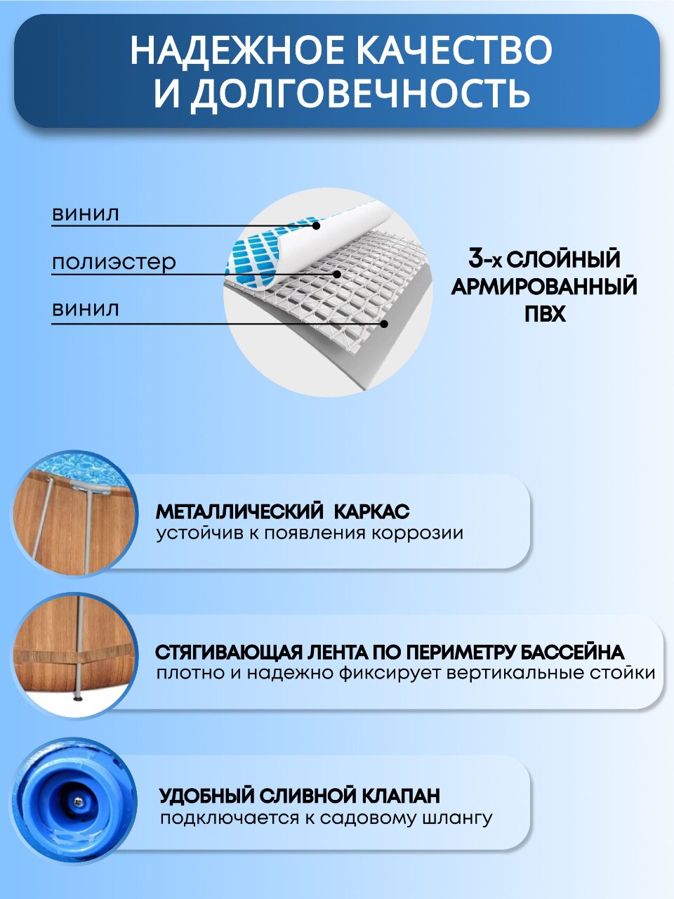 Материал чаши и стенок бассейна имеет 3х слойный армированный ПВХ (винил, полиэстер, винил).