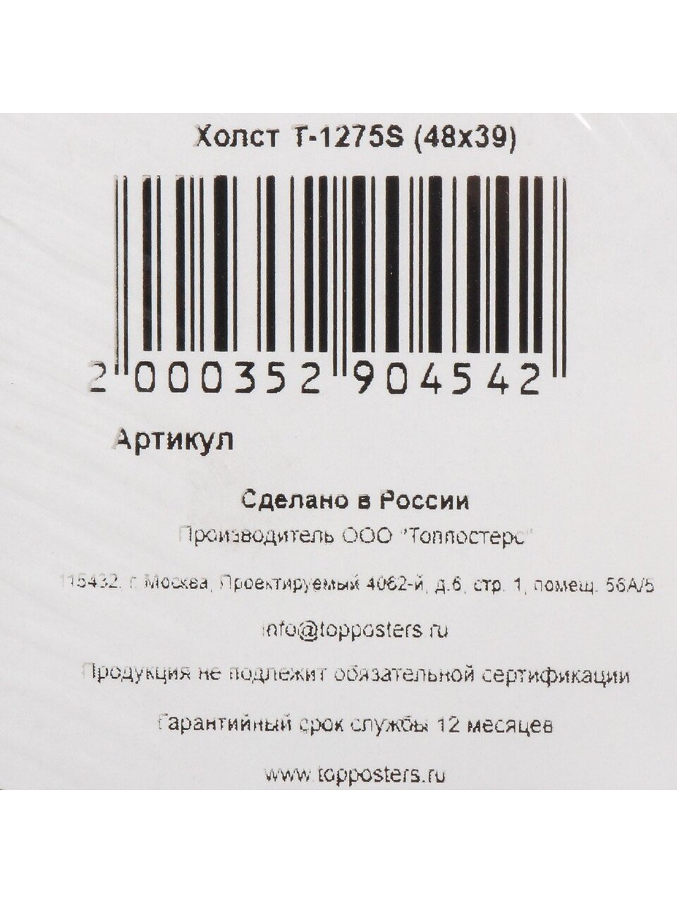 Основа — плотный холст, обеспечивающий долговечность и насыщенность цветов. Артикул: T-1275S, страна продавца — Россия.