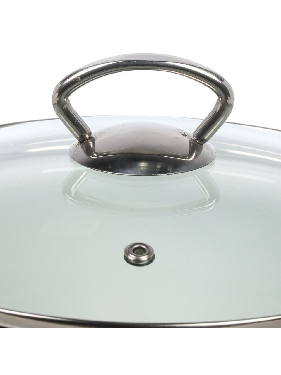 - Изделие комплектуется нержавеющим ободком на крышке и кастрюле, а сама крышка изготовлена из жаропрочного стекла.