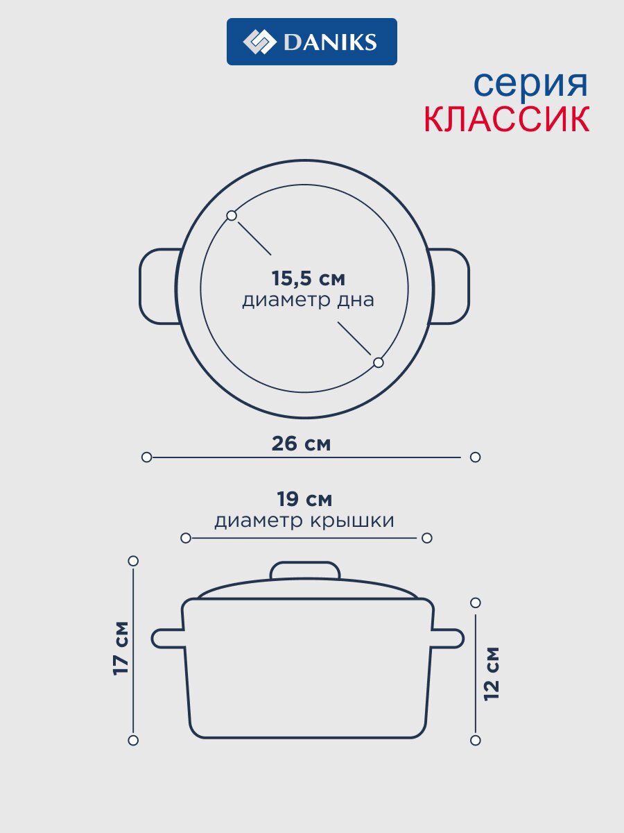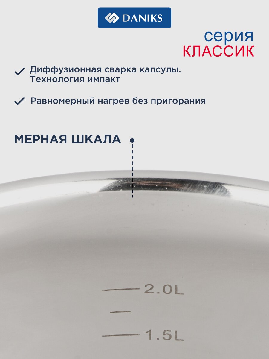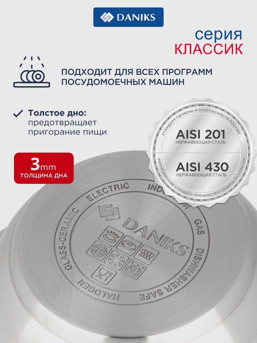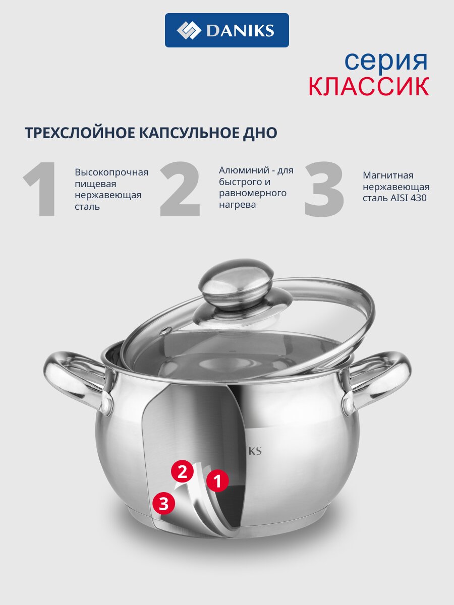 Кастрюля Daniks Классика 2.9 л из нержавеющей стали: идеальный выбор для индукционных плит и ежедневной готовки. Прозрачная крышка, мерная шкала, долговечность.