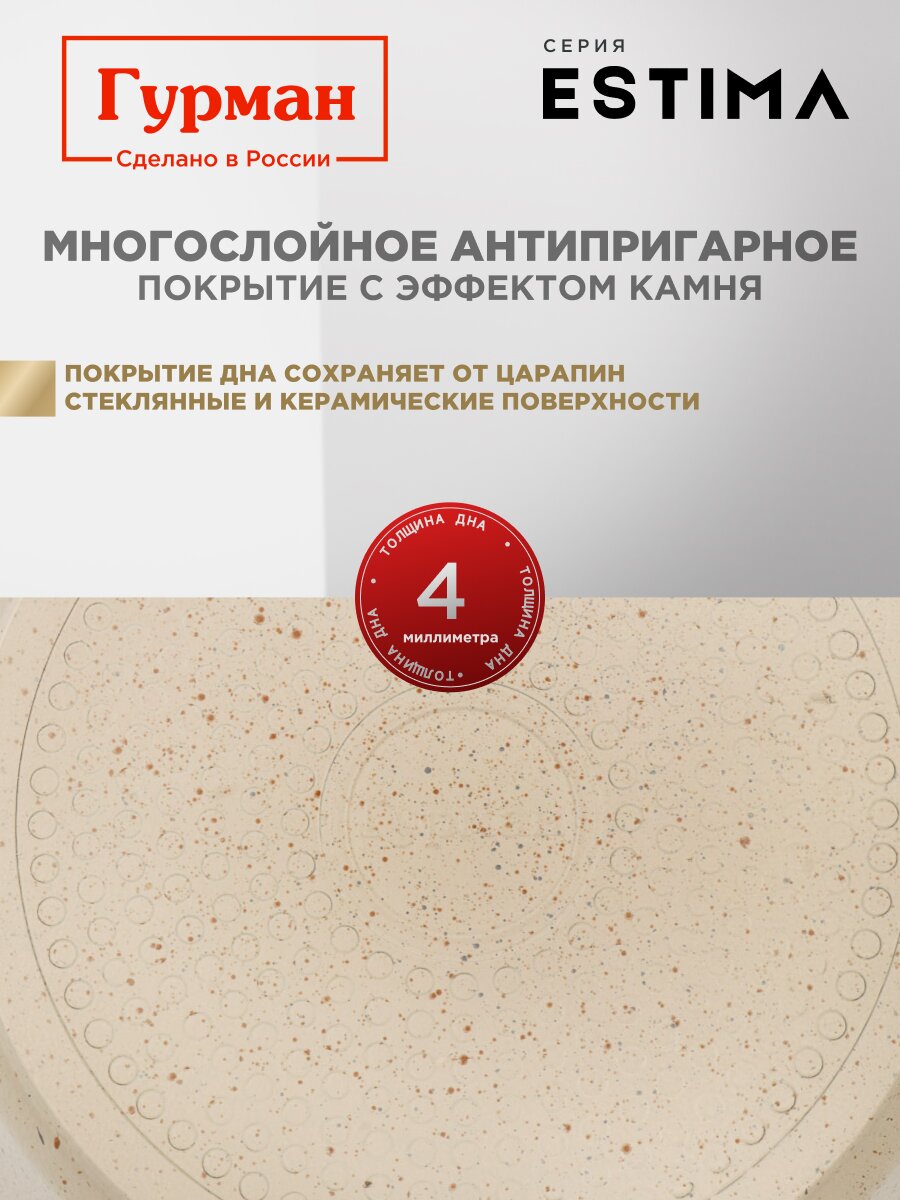 Кастрюля алюминиевая с мраморным антипригарным покрытием 3 л Гурман Estima — идеальный выбор для индукционных плит и быстрой готовки без пригорания. Прозрачная крышка, долговечность, стильный бежевый цвет.