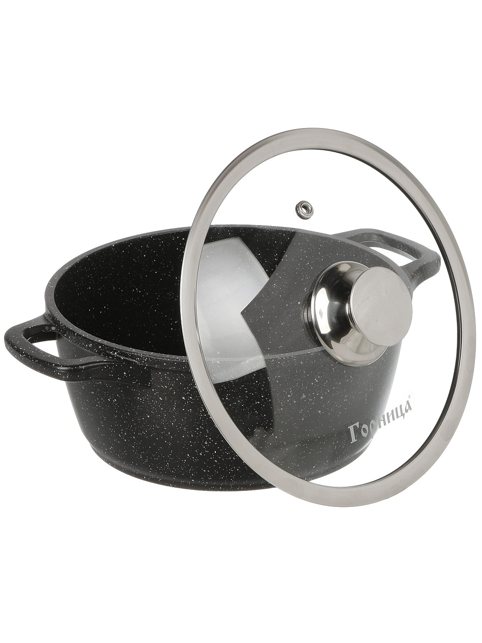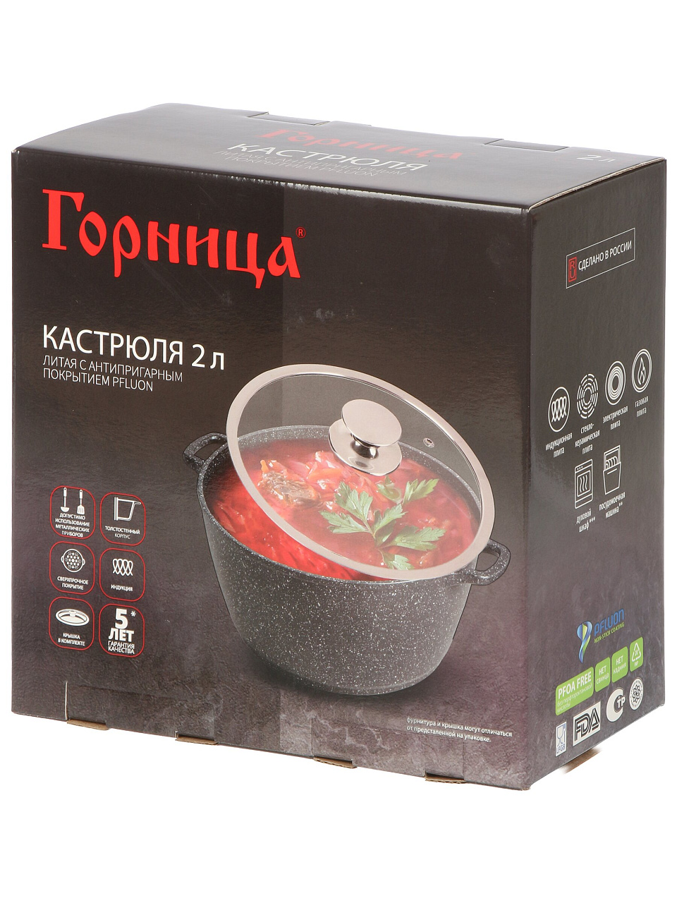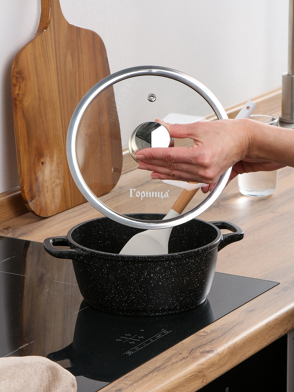 Кастрюля Горница Гранит Induction 2 л с антипригарным покрытием и стеклянной крышкой — идеальный выбор для индукционных плит и здорового питания дома и на даче.
