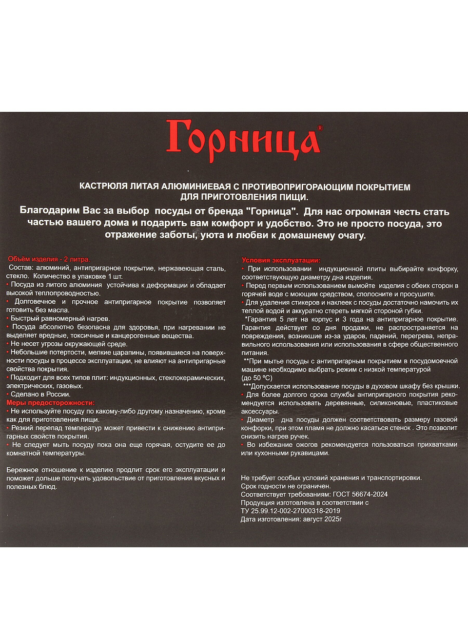 - Оптимальный объём 2 литра, литые ручки для надежного хвата, алюминий — быстрое и равномерное нагревание, срок службы до 5 лет.