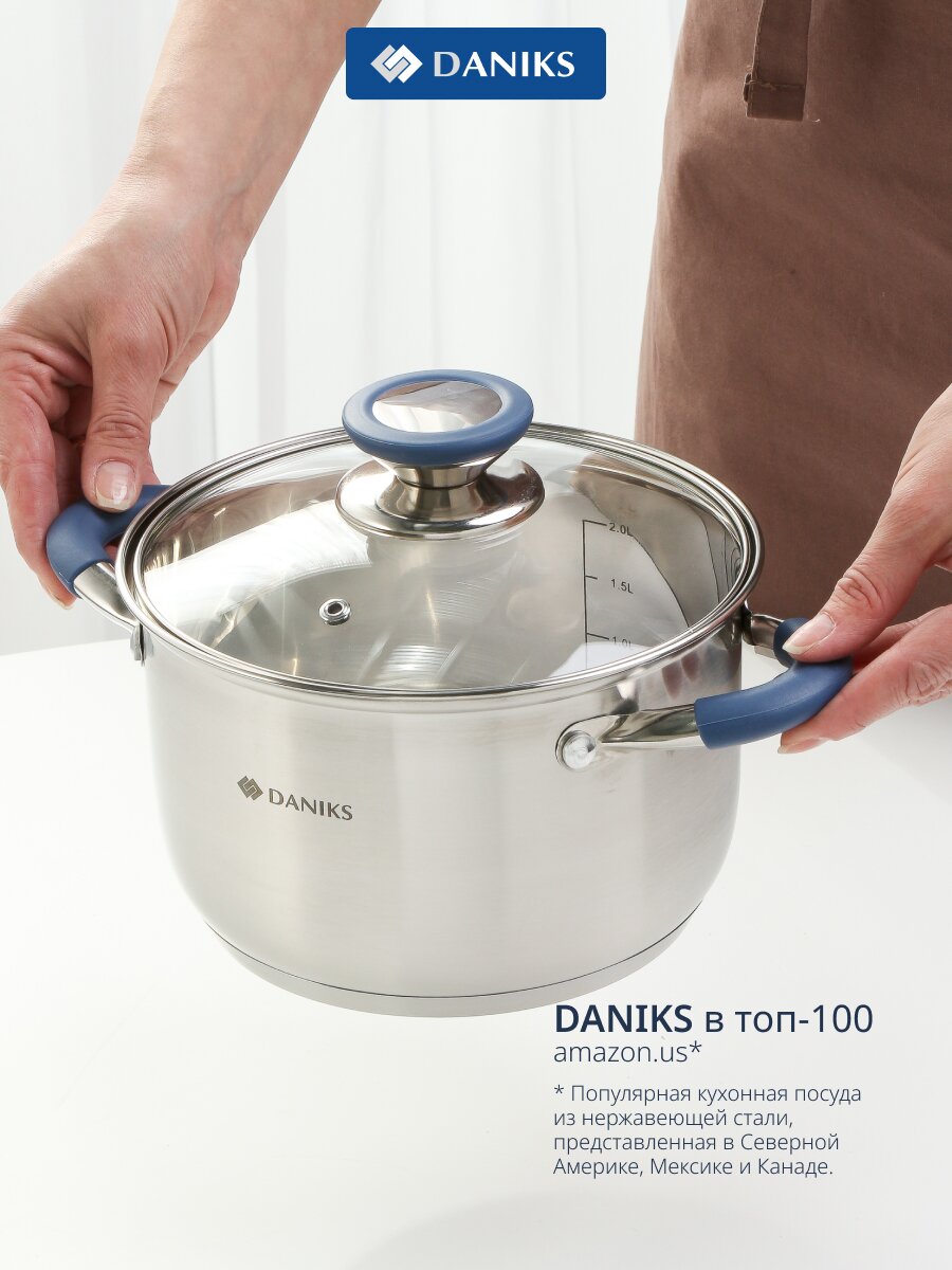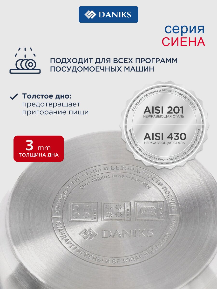 Кастрюля Daniks Сиена 2.9 л из нержавеющей стали: идеальный выбор для индукционных плит, стеклянная крышка, мерная шкала, долговечность и универсальность.