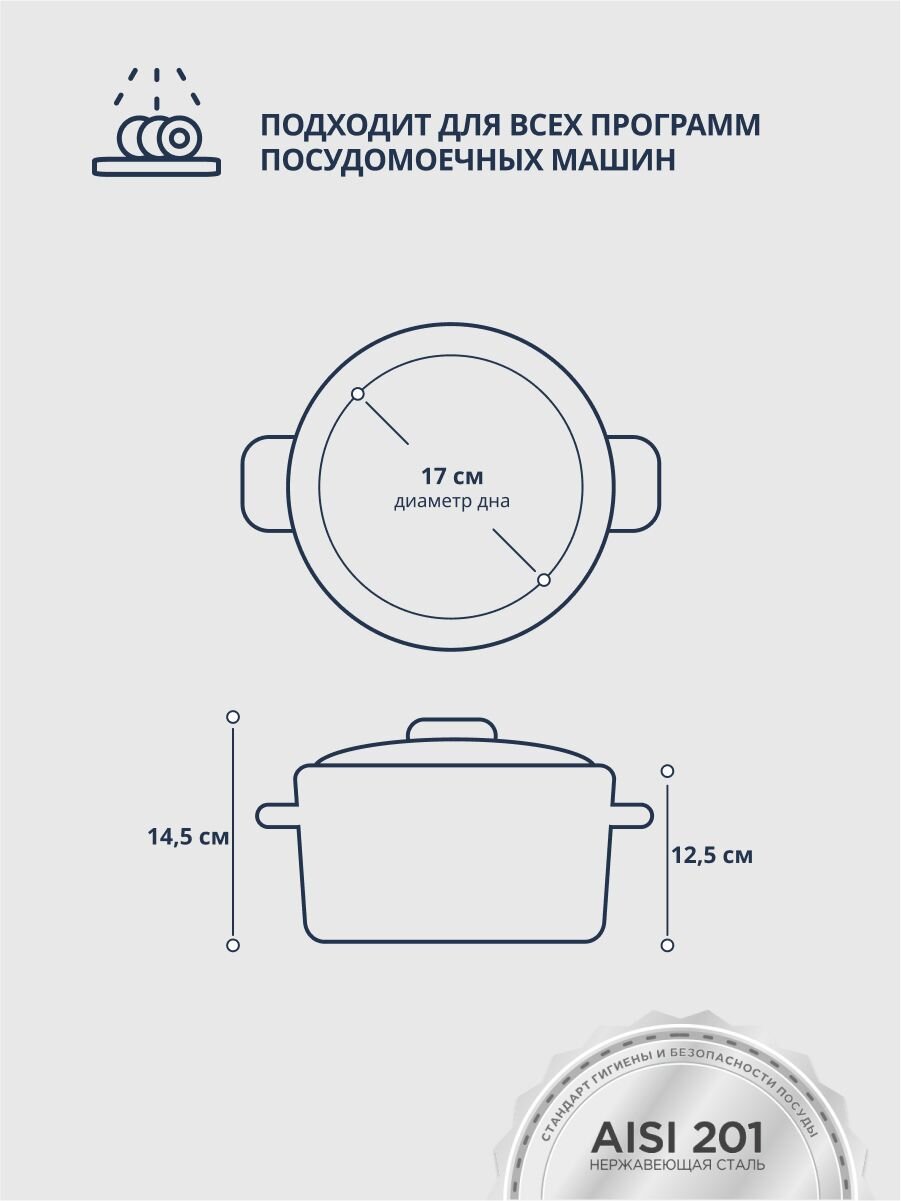 Диаметр кастрюли — 20 см, диаметр дна — 17 см, высота с крышкой — 14,5 см, без крышки — 12,5 см.