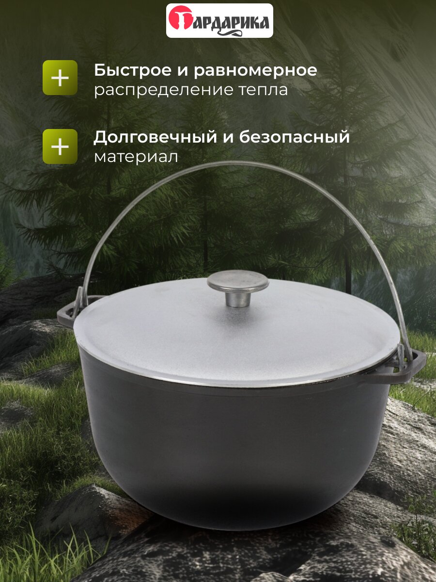 - В походном чугунном казане можно приготовить различные блюда, что делает его незаменимым помощником для туристов, рыбаков и охотников.