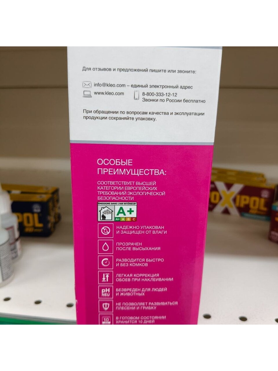 Использование модифицированного крахмала и противогрибковых добавок в составе клея KLEO EXTRA обеспечивает его устойчивость к воздействию влаги и предотвращает появление плесени. Это гарантирует долговечность и сохранность отделочных материалов, а также создает здоровую и безопасную среду в помещении.