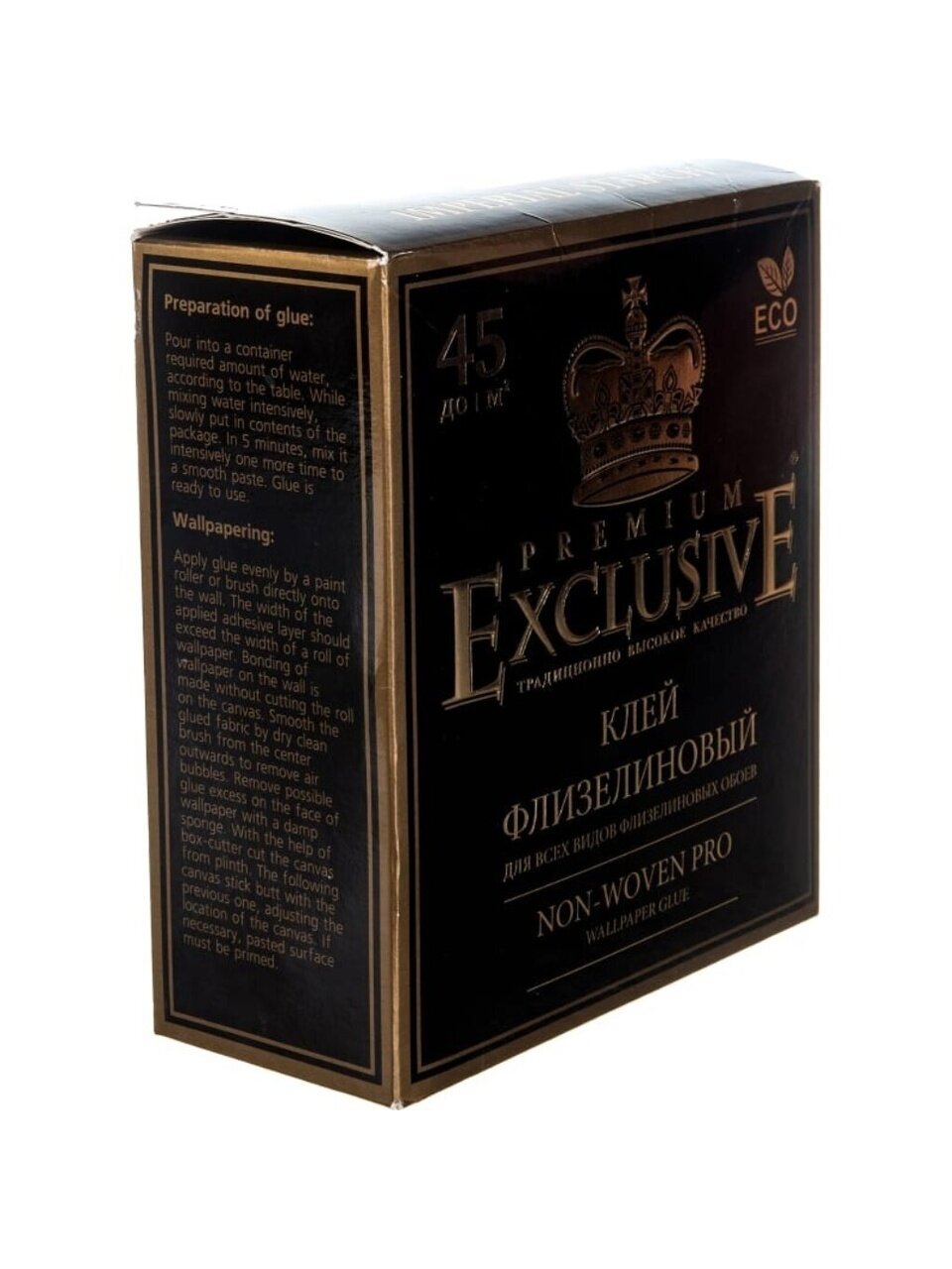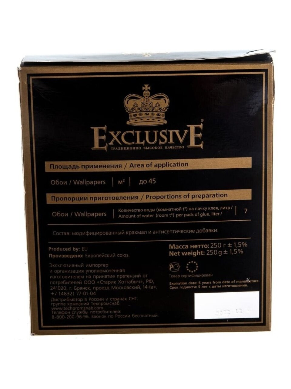 Клей Exclusive Proffesional применяется для флизелиновых обоев. Сухая смесь разводится на 7 литров воды и рассчитана на площадь 45 м². Состав на основе модифицированного крахмала безопасен для здоровья. Антисептические добавки препятствуют появлению плесени и грибка. Герметичная упаковка надежно защищает от попадания влаги и продлевает срок хранения.