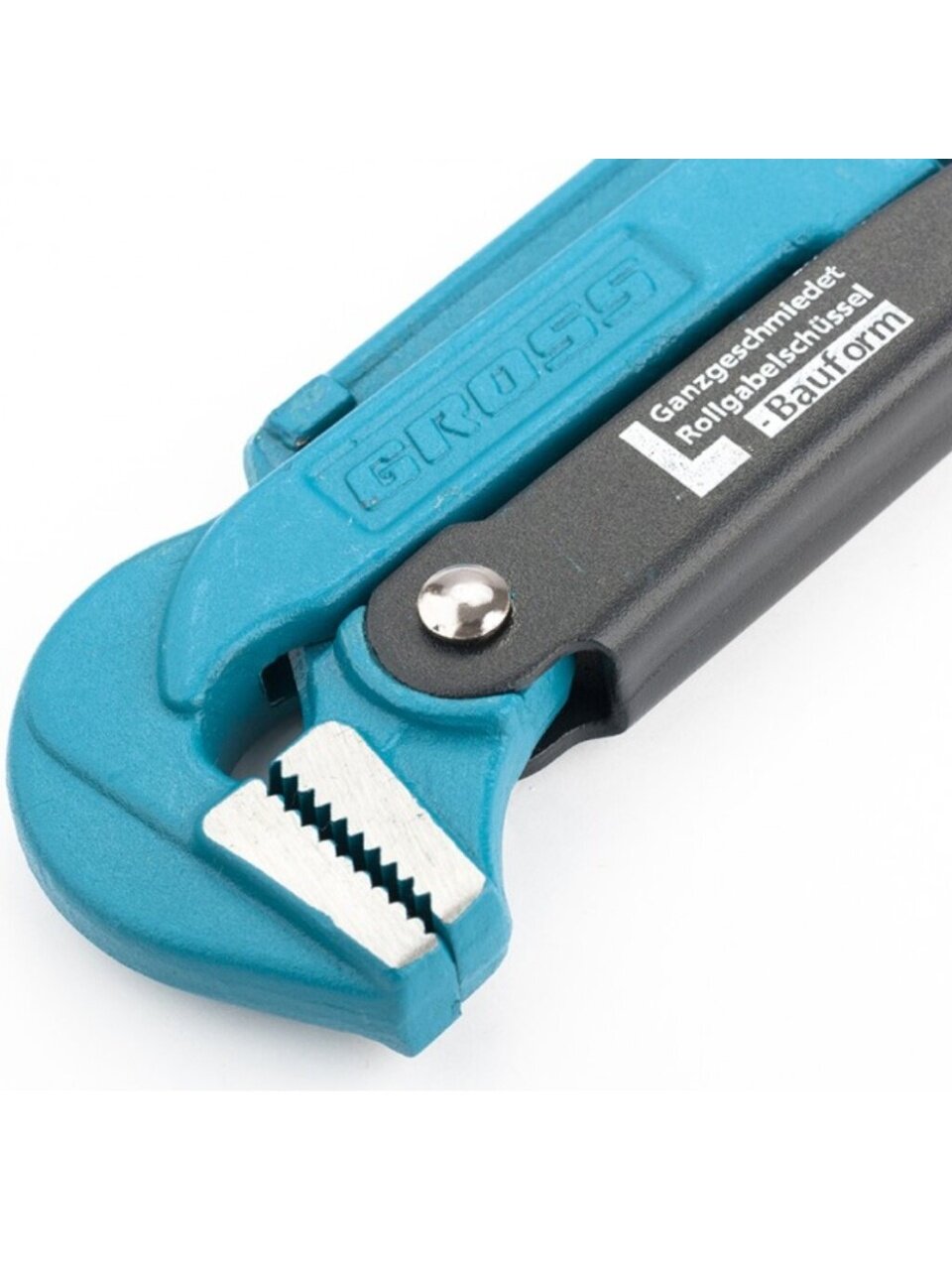 Ключ трубный рычажный типа L усиленной конструкции, применяется при повышенных нагрузках. Предназначен для захватывания и вращения труб и соединительных частей трубопроводов. Изготовлен из высококачественной хромованадиевой стали. Имеет порошковое антикоррозийное покрытие. Губки дополнительно закалены токами высокой частоты до твердости 57–60 HRС. Прогрессивная форма зуба с наклоном против направления вращения обеспечивает самоблокируемый захват деталей. Верхняя ручка имеет выштампованный Т-образный профиль. Регулировочная гайка снабжена стопорным кольцом.
