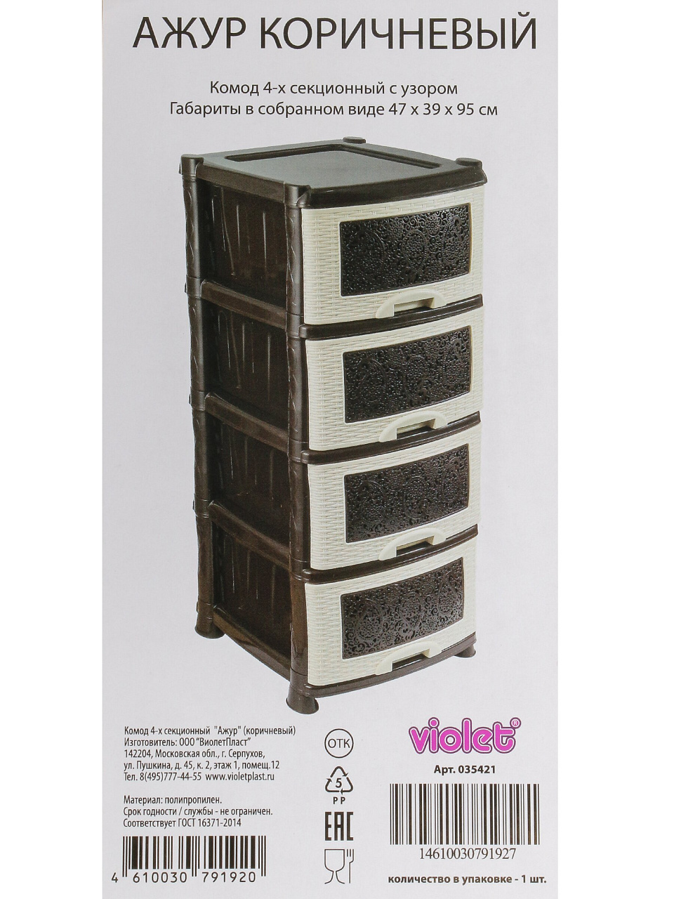 Вы можете приобрести «Комод 4 ящика, Ажур, 47х39х95 см, коричневый, 0354/035421, Violet» и другие товары в нашем интернет-магазине в Иваново по низким ценам и с бесплатным самовывозом.