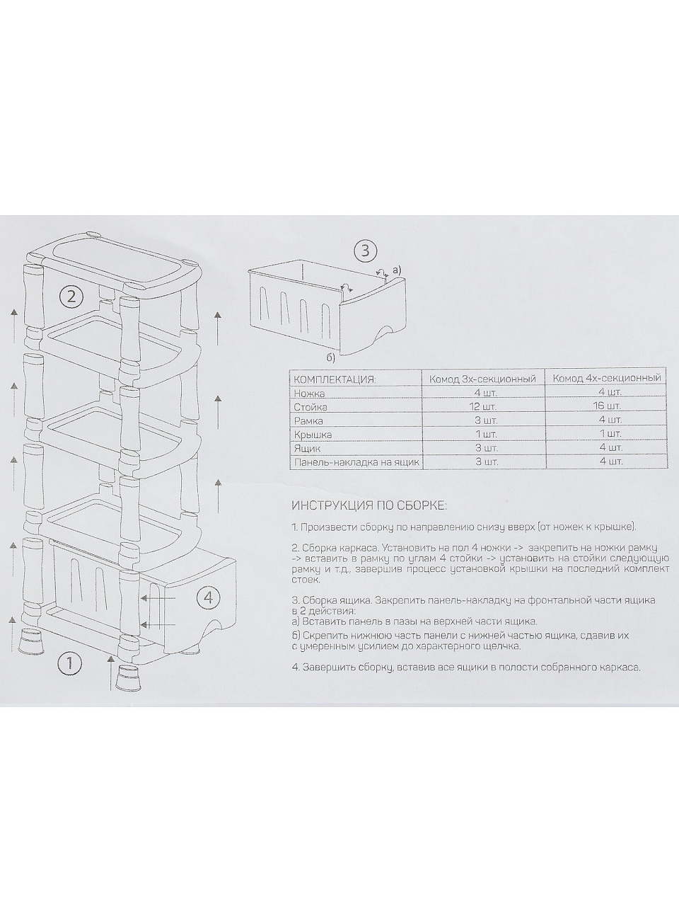 У комода 4 глубоких выдвижных ящика на полозьях, что позволяет удобно хранить одежду, бельё, игрушки или документы без перегрузки.