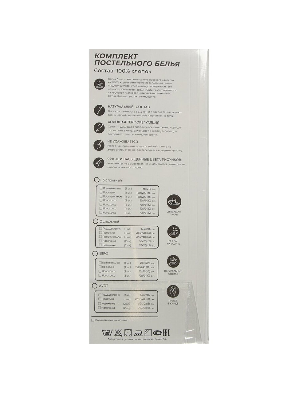В отличие от классического хлопка, сатин люкс плотнее и прочнее, меньше мнется, дольше сохраняет свежий вид. Многих интересует: «Подходит ли для чувствительной кожи?» — да, натуральный хлопок гипоаллергенен и безопасен для ежедневного использования. Комплект не требует сложного ухода: достаточно машинной стирки при 30°С, чтобы сохранить мягкость и насыщенность цвета.
