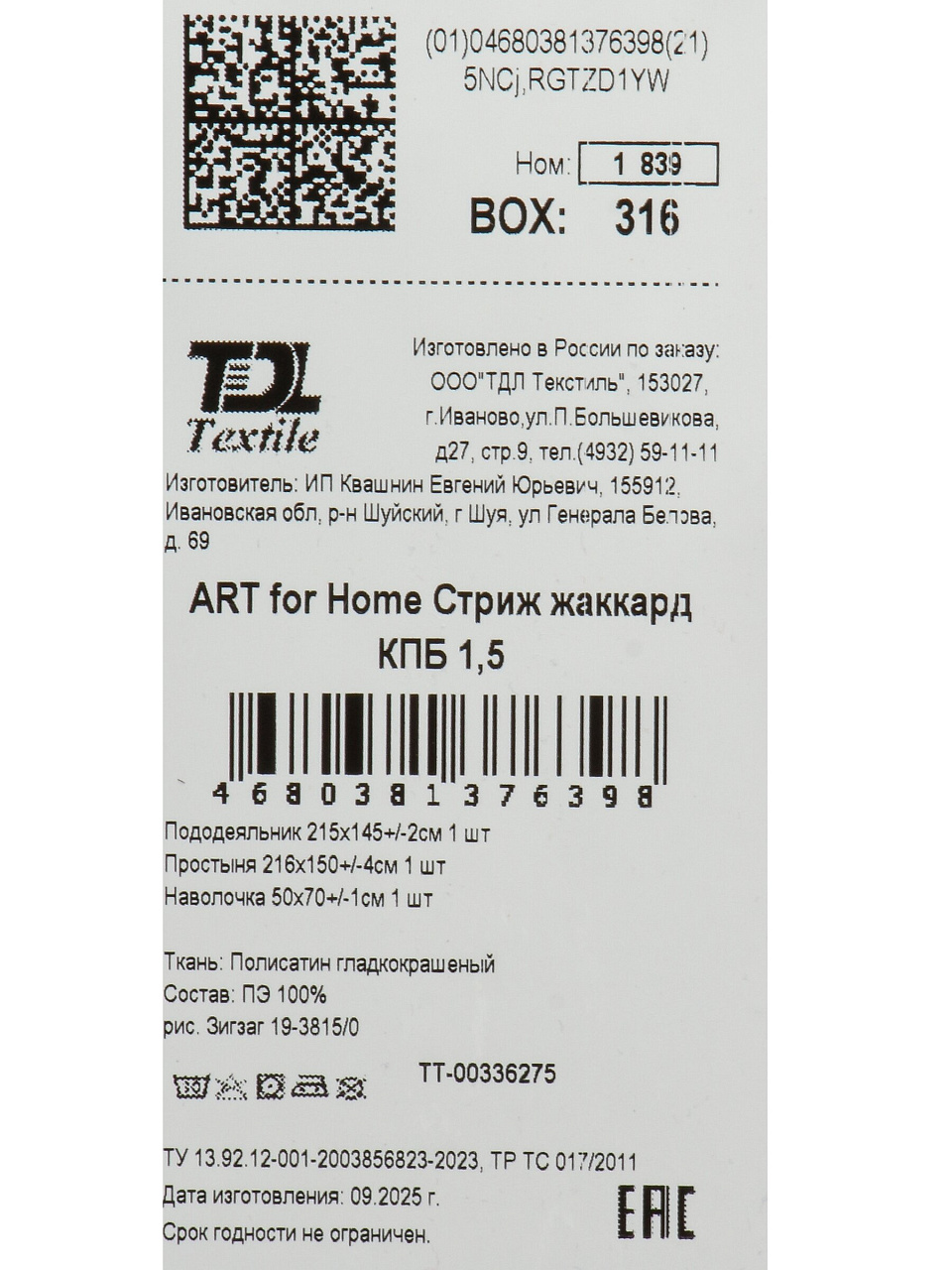 Ткань — 100% полиэстер (полисатин), жаккардовое переплетение. Рекомендована стирка при 40°C, гладить не требуется.