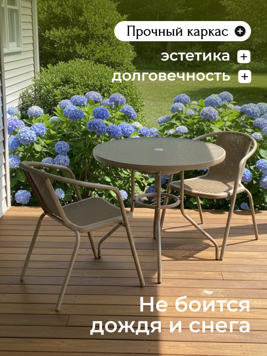 Компактные размеры делают комплект удобным для небольших пространств: балконов, террас и веранд. Стол диаметром 70 см и высотой 80 см обеспечивает достаточно места для сервировки завтрака, обеда или вечерних посиделок. Стулья размером 43х57х72 см выдерживают нагрузку до 110 кг, что гарантирует надежность и безопасность использования.