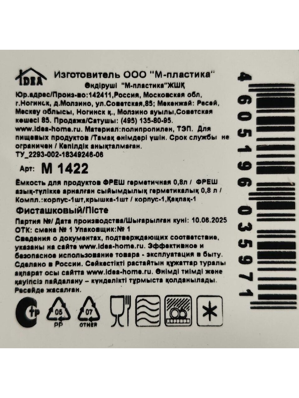 Контейнер пищевой 0.8 л Idea Фреш — герметичный пластик, защелка, подходит для СВЧ и заморозки. Идеальный выбор для хранения и транспортировки еды.