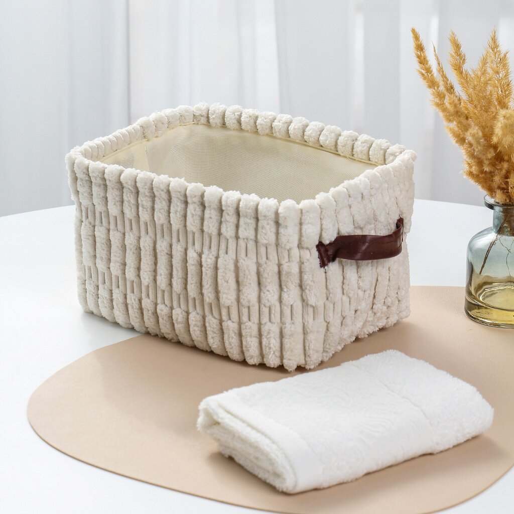 Как выбрать корзину для хранения? Обратите внимание на материал и размеры: фланель приятна на ощупь, а габариты 23×15×13 см подходят для полок и шкафов. В отличие от пластиковых или плетёных корзин, фланелевая модель складная, не занимает лишнего места при хранении и легко стирается.