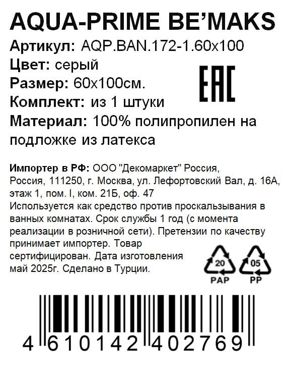 Антискользящий коврик для ванной 60х100 см Aqua-Prime: безопасный комфорт, долговечность и стильный серый дизайн для вашего дома и дачи.