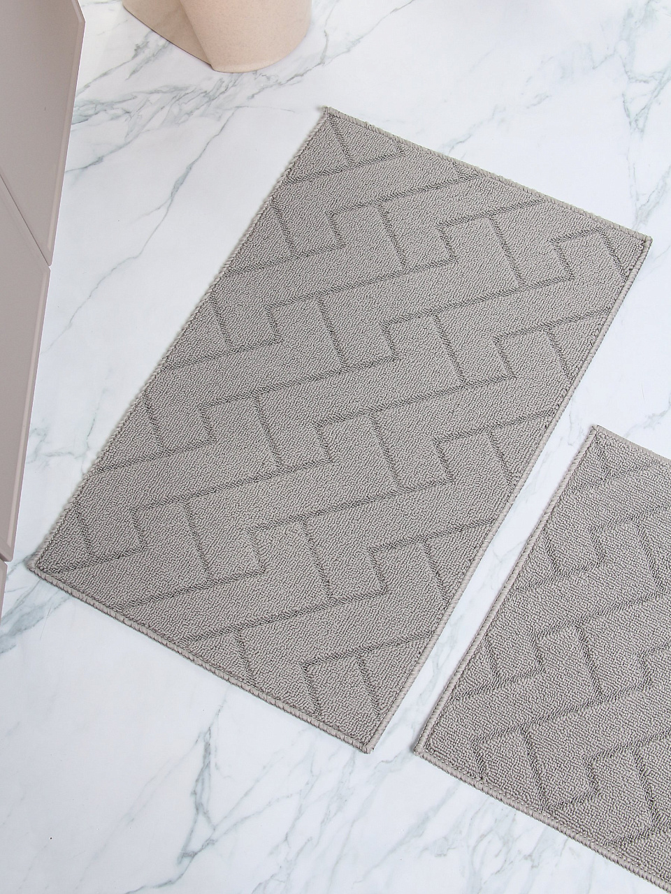 Часто спрашивают, подходит ли этот набор для теплых полов или можно ли использовать коврики в туалете — да, материал устойчив к температуре и не деформируется. Серый цвет с ненавязчивым орнаментом легко впишется в любой интерьер, а отсутствие присосок делает уход за ковриками проще.