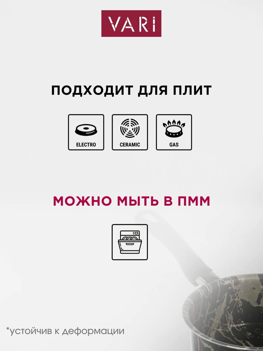 - Современное антипригарное покрытие — пища не пригорает, легко мыть даже в посудомоечной машине;