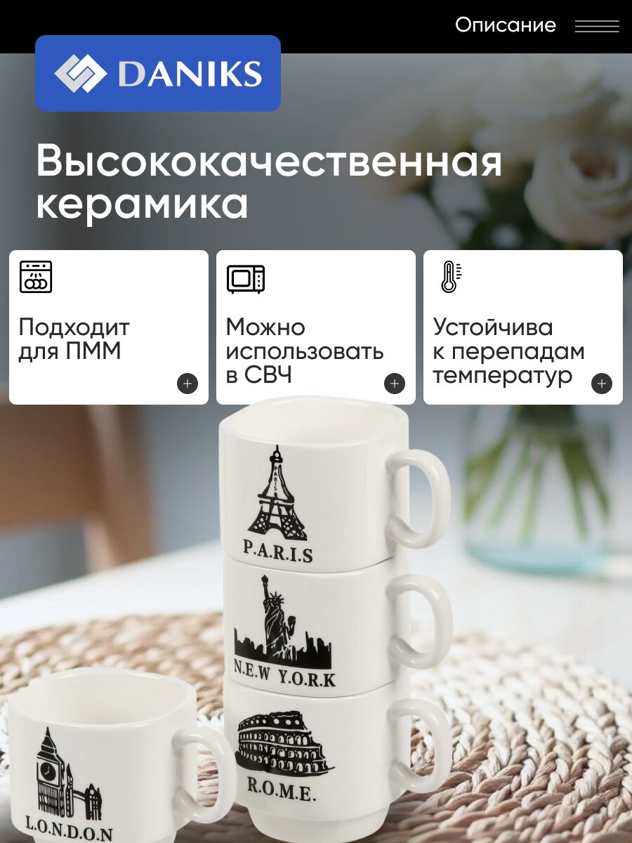 Ищете, какой набор кружек выбрать для подарка или уютного чаепития? Daniks "Столицы" — это 4 керамические кружки объёмом 200 мл на прочной металлической подставке. Такой комплект не только красиво смотрится в интерьере, но и подходит для разных стилей: классического и современного. Кружки легко мыть в посудомоечной машине, а также можно использовать в микроволновой печи — это удобно для тех, кто ценит время и комфорт.