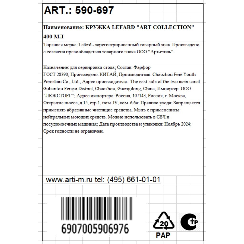 Вы можете приобрести «Кружка фарфор, 400 мл, Art Collection, Lefard, 590-697» и другие товары в нашем интернет-магазине в Армавире по низким ценам и с бесплатным самовывозом.