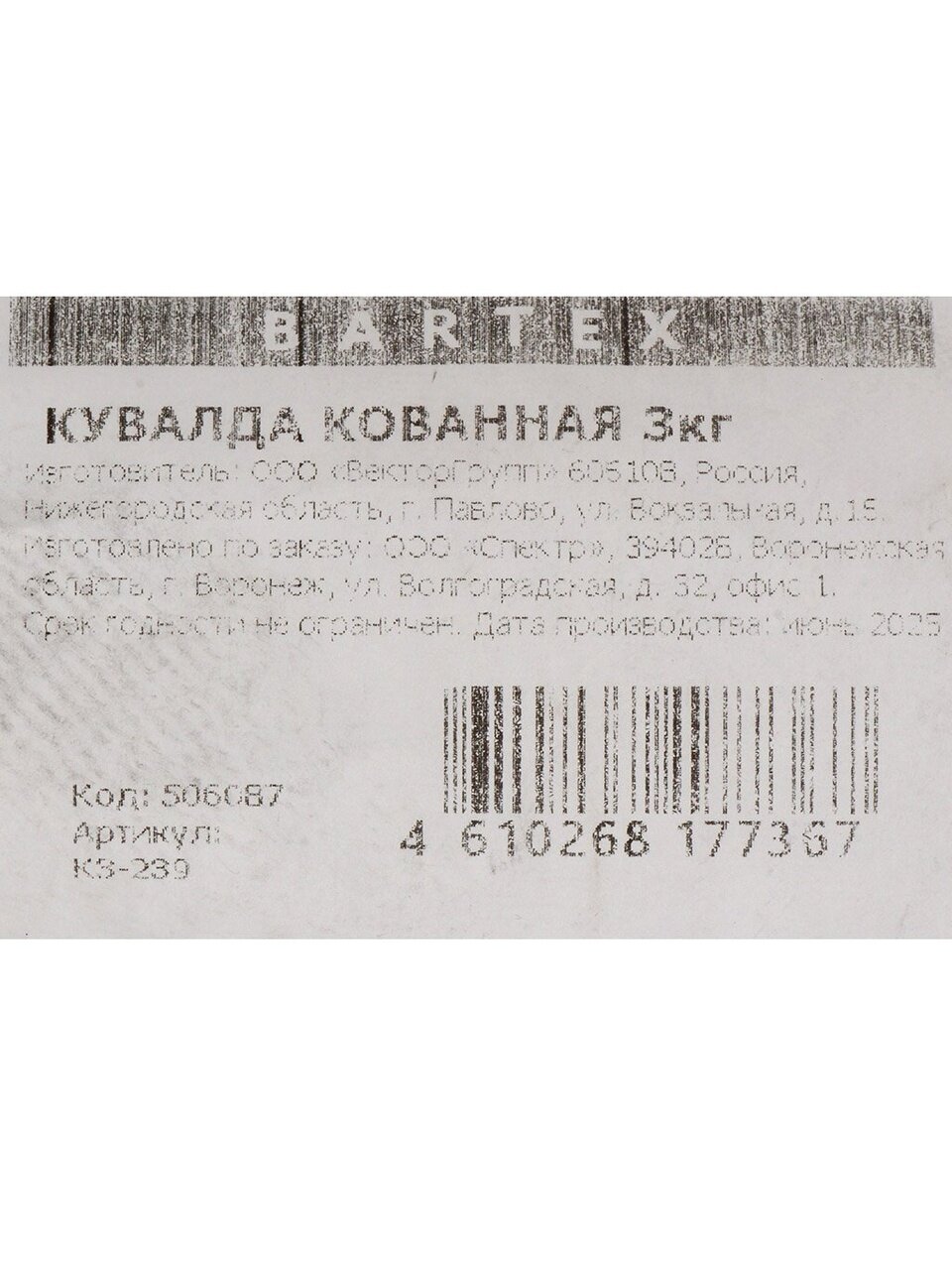 Какие габариты и материалы использованы в кувалде Bartex?