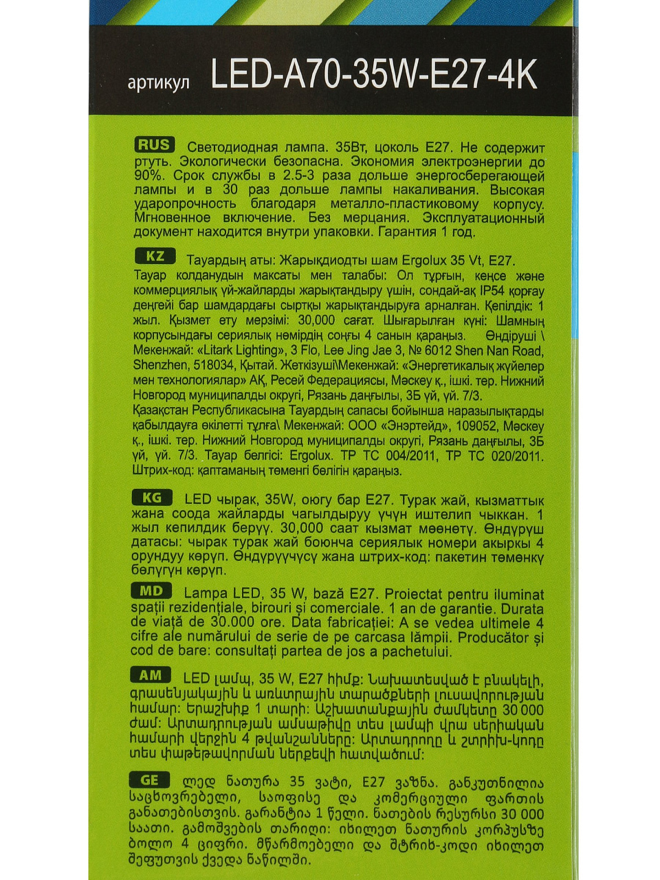 Вы можете приобрести «Лампа светодиодная E27, 35 Вт, 300 Вт, груша, 4000 К, нейтральный белый свет, Ergolux, 14231» и другие товары в нашем интернет-магазине в Брянске по низким ценам и с бесплатным самовывозом.