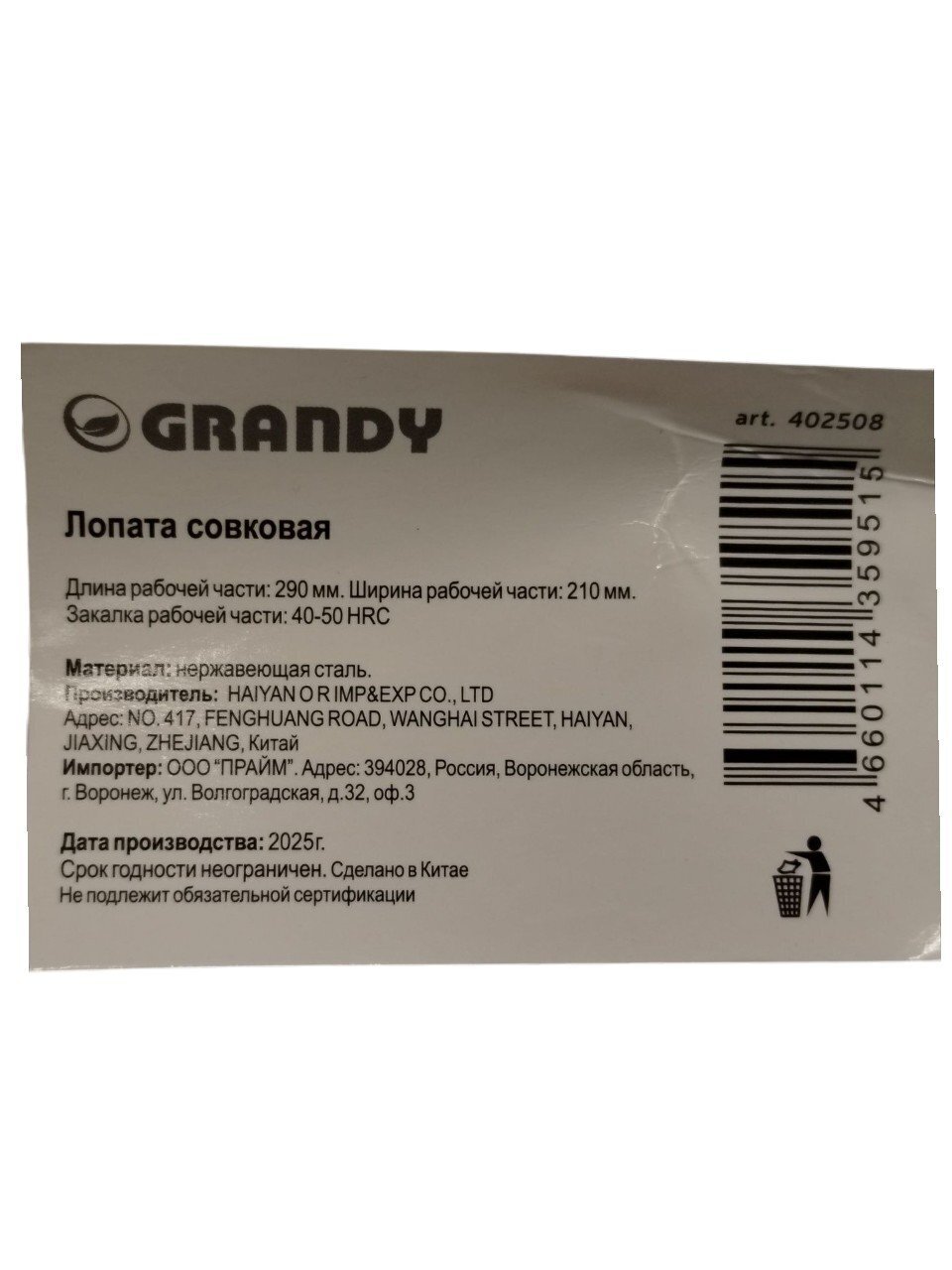 Рабочая часть лопаты Grandy — 210 мм в ширину и 290 мм в длину, что оптимально для работы с разными сыпучими и строительными материалами.