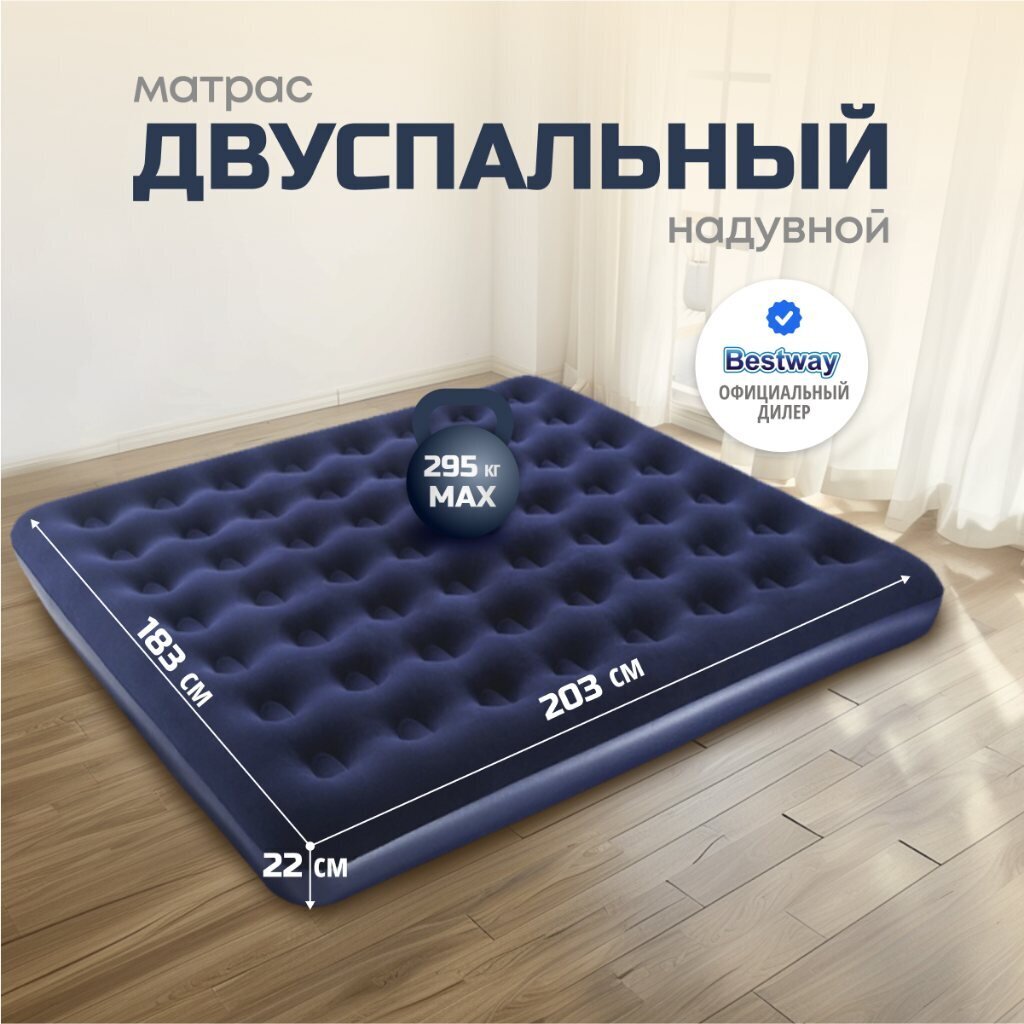 Матрас Bestway, выполненный из прочного флокированного винила, обеспечивает комфортный и здоровый сон в любых условиях. Его уникальная конструкция позволяет ему сохранять форму даже при неравномерном распределении нагрузки. Этот матрас легко надувать и сдувать, что делает его прекрасным выбором для путешествий или отдыха на природе. Кроме того, он может служить дополнительным спальным местом в квартире или доме. Если пространство ограничено, надувные матрасы становятся отличным решением для размещения гостей. Всё, что нужно сделать, - это надуть матрас и разместить его в свободной комнате.